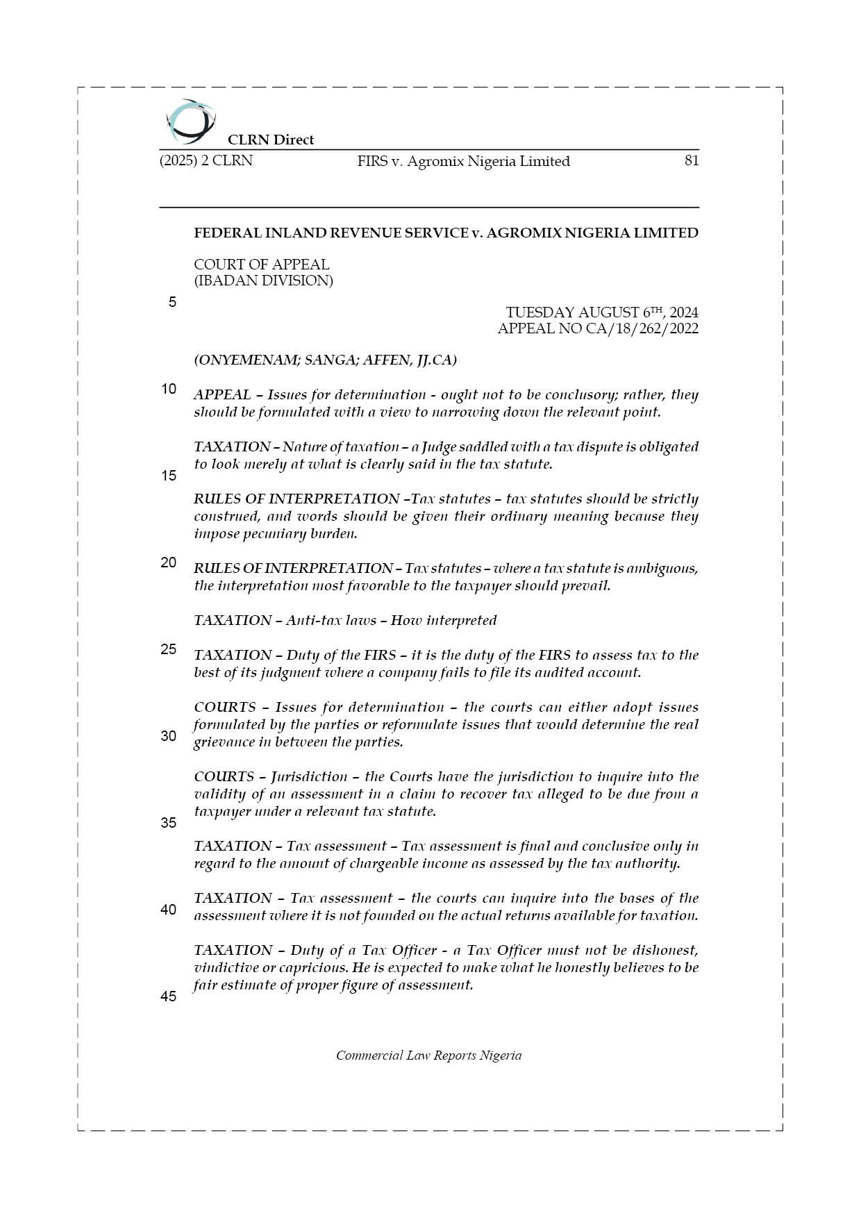The Federal Inland Revenue commenced the action against Agromix Nigeria Limited, the Responded, alleging that the Respondent had neglected or failed to file audited accounts and returns for the year 2015/2016 as it was required to do under the Companies and Income Tax Act. The Respondent commissioned a firm of Estate Surveyors and Values which valued the Respondents property at situate at Abuja, FCT at N126,870,000,00 and based on the value of the property and a deemed profit of N25,374,000, the Respondent’s tax liability for the year 2016 was assessed to the best of the Appellant’s judgment at N7,612,200 (being 30% of deemed profit. The Appellant claimed that an assessment/demand notice was posted at the Respondent’s property in Abuja but the Respondent’s registered address is situate at Agbeloba House, 56 Quarry Road, Abeokuta, Ogun State.