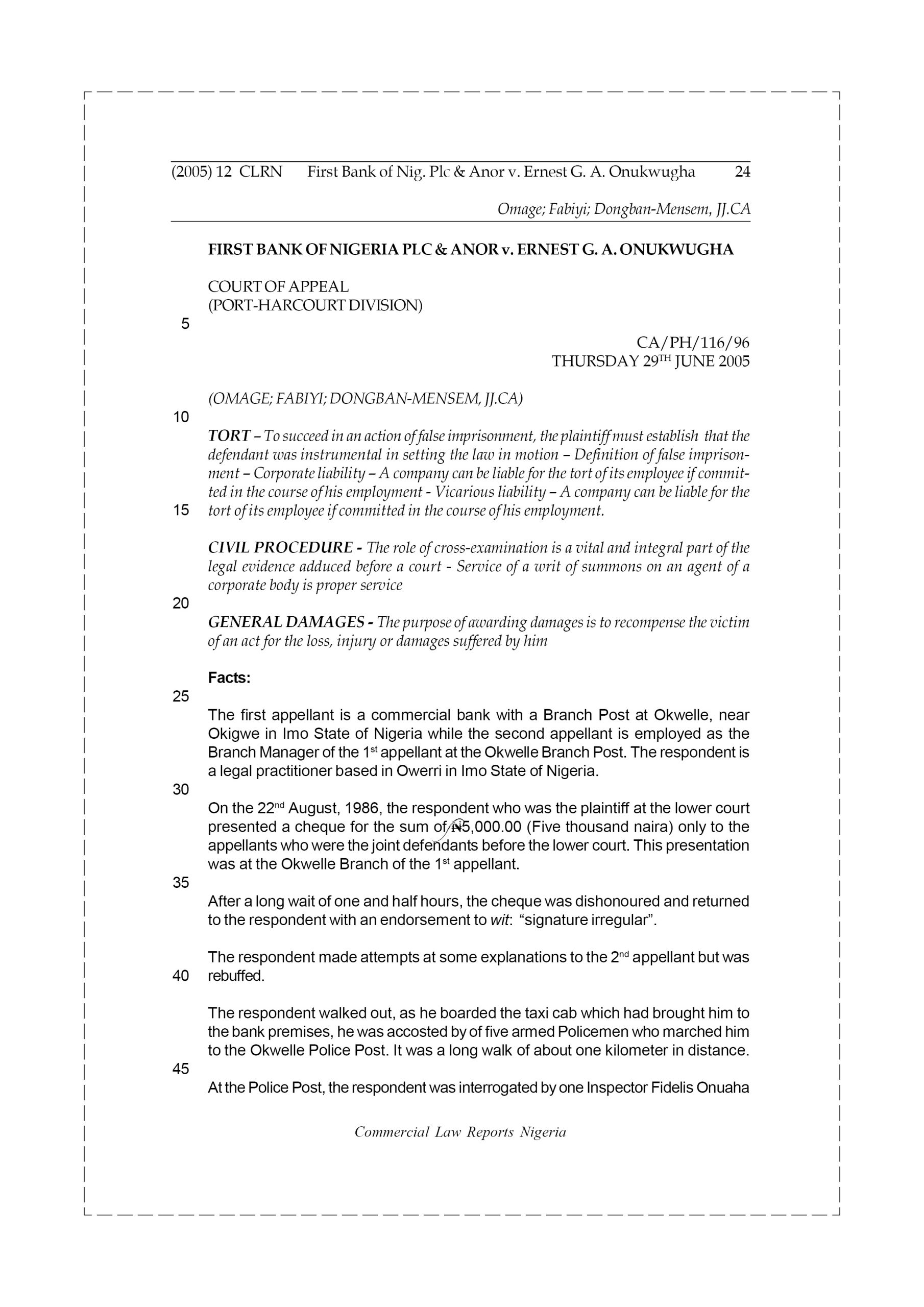 The first appellant is a commercial bank with a Branch Post at Okwelle, near Okigwe in Imo State of Nigeria while the second appellant is employed as the Branch Manager of the 1st appellant at the Okwelle Branch Post. The respondent is a legal practitioner based in Owerri in Imo State of Nigeria.