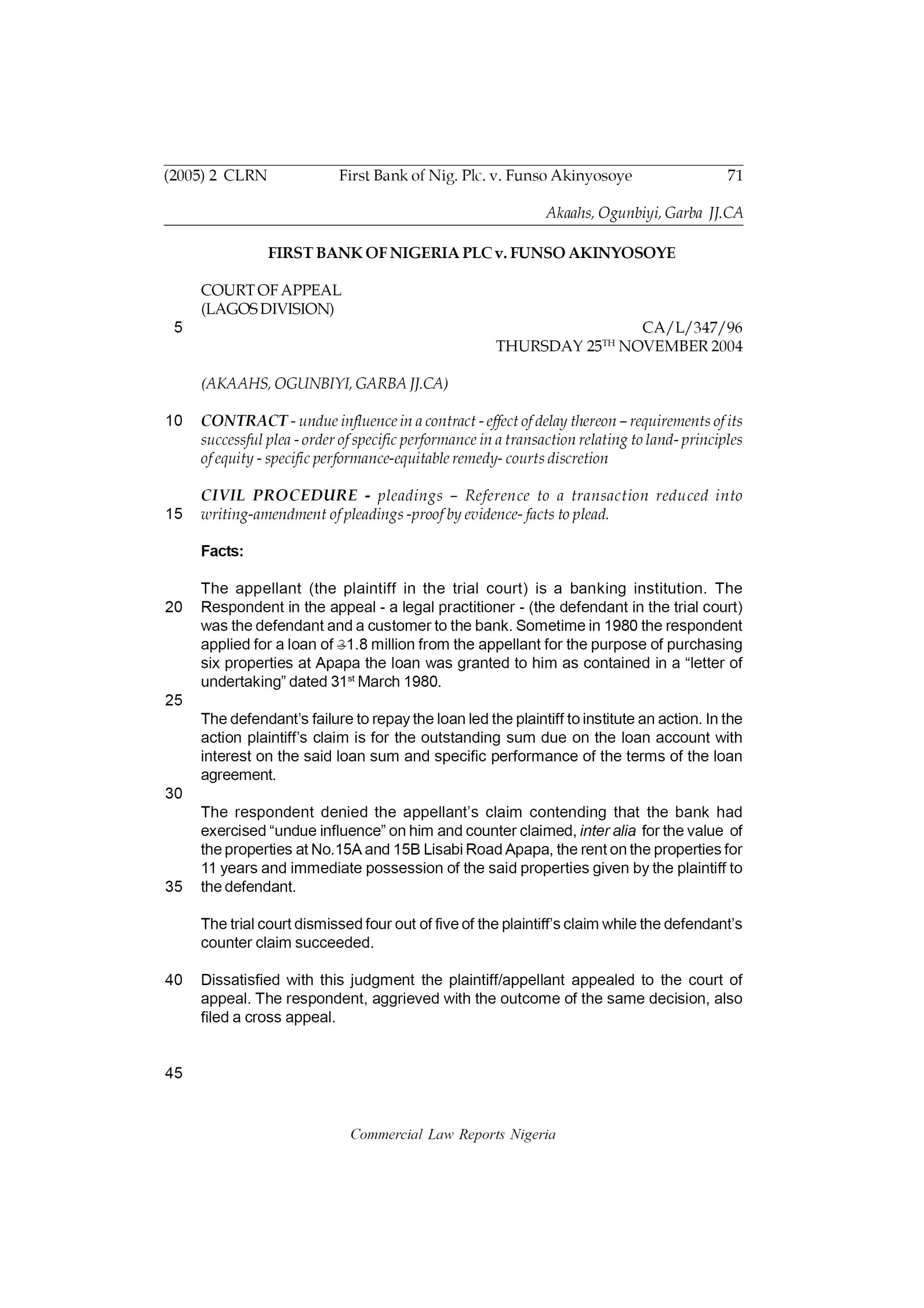 The respondent denied the appellant’s claim contending that the bank had exercised “undue influence” on him and counter claimed, inter alia for the value of the properties at No.15A and 15B Lisabi Road Apapa, the rent on the properties for 11 years and immediate possession of the said properties given by the plaintiff to the defendant.