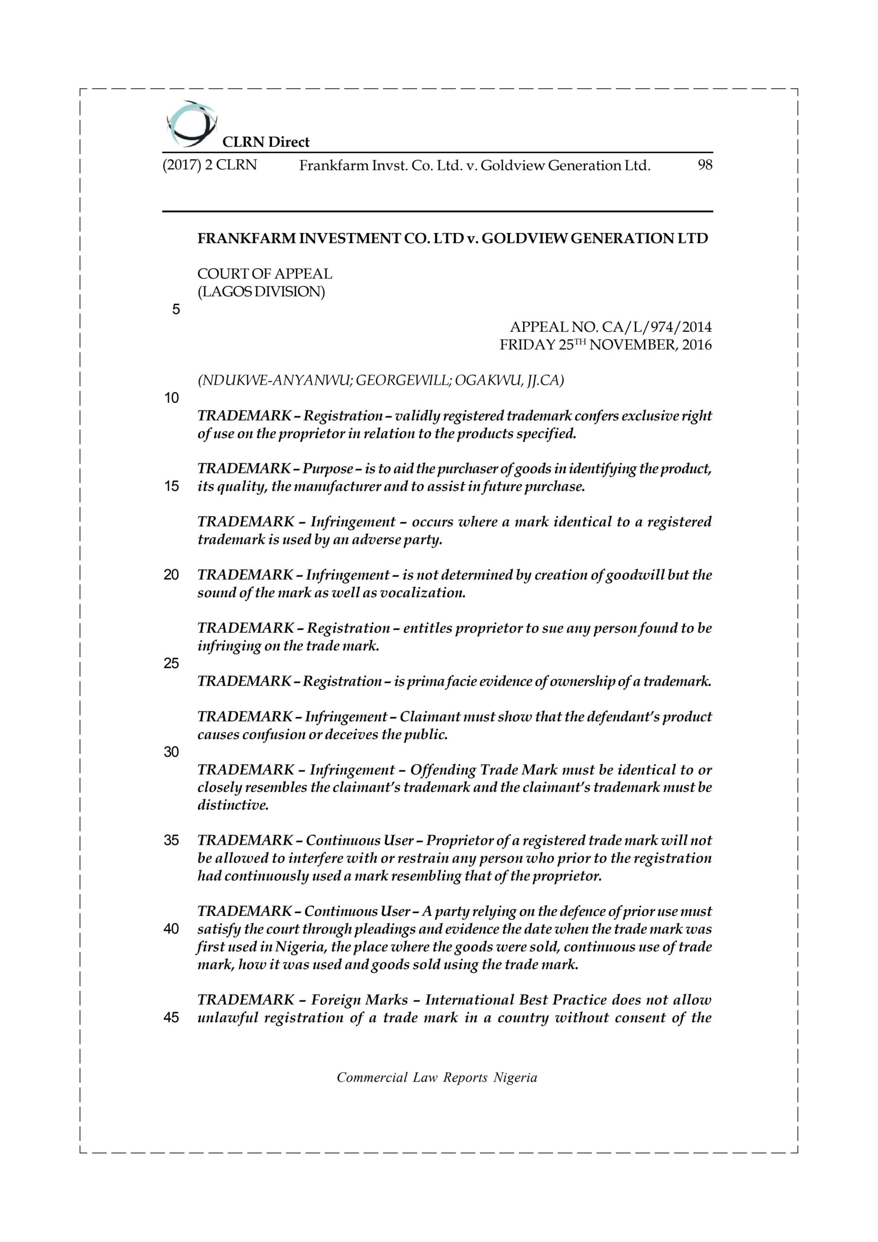The appellant alleged infringement of its trademark by the respondent and filed an action against it at the Federal High Court, Lagos Division. The appellant contended that it registered a trademark in 2008 and that the respondent had been in breach of its car air freshener products, the subject of the trademark by using a similar trademark. It sought a perpetual injunction against the respondent from passing-off or attempting to pass off the goods of the appellant as its own. However, the respondent contended that the products were manufactured by a Chinese company which had been supplying the respondent as well as the appellant before the appellant registered the trademark without permission from the Chinese manufacturers. The matter went to trial and the court gave judgment in favour of the respondent and dismissed the claim of the appellant.
