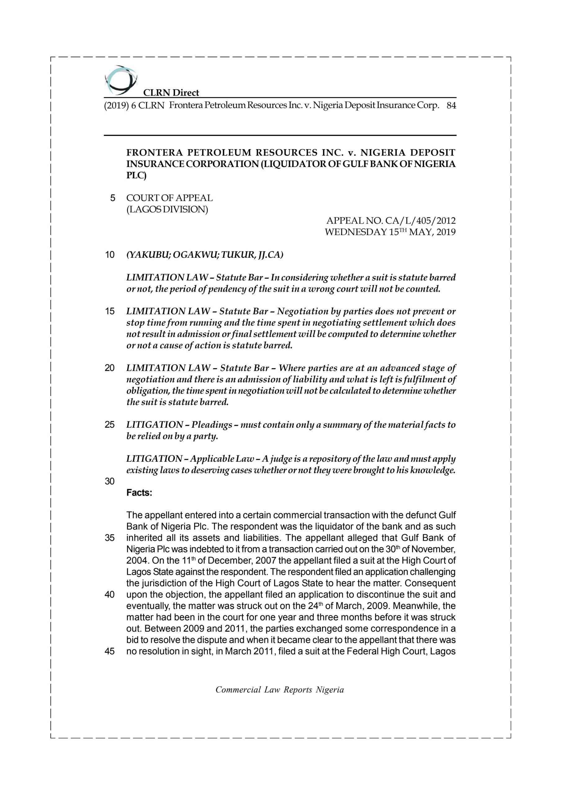 The appellant entered into a certain commercial transaction with the defunct Gulf Bank of Nigeria Plc. The respondent was the liquidator of the bank and as such inherited all its assets and liabilities. The appellant alleged that Gulf Bank of Nigeria Plc was indebted to it from a transaction carried out on the 30th of November, 2004. On the 11th of December, 2007 the appellant filed a suit at the High Court of Lagos State against the respondent.