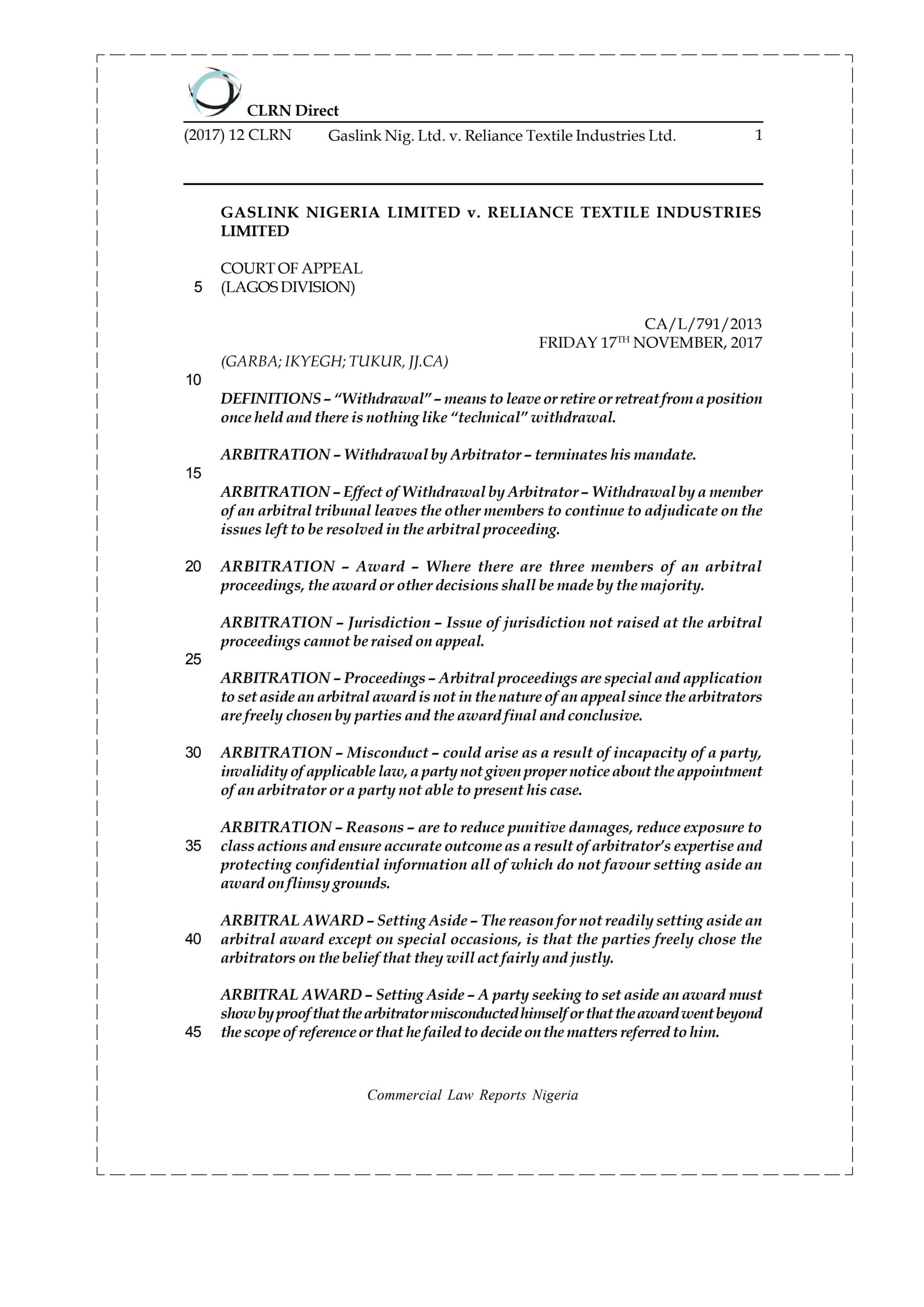 Gaslink Nig. Ltd. v. Reliance Textile Industries Ltd.