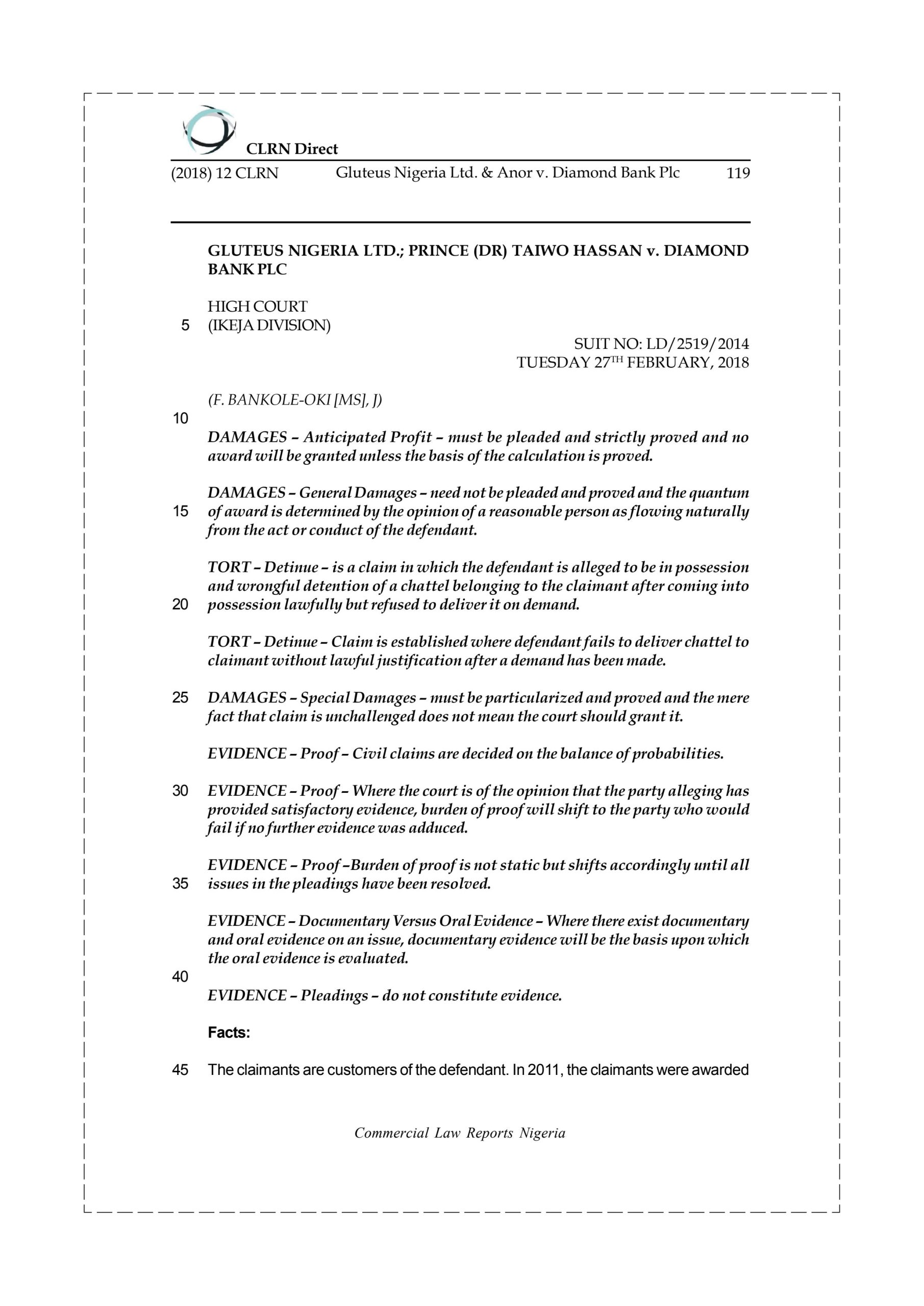 The claimants approached other banks but could not secure any facility to execute the project. The claimants filed a suit at the High Court of Lagos State against the defendant. Among several reliefs, an order directing the defendant to release to the claimants the original title of the property. The claimant also sought an order of perpetual injunction restraining the defendant, its servants or agents, from using the title deeds for any purpose without the prior consent of the claimants. The claimants further sought anticipated profit of N8,981,354,63 (Eight Million, Nine Hundred and Eighty One Thousand, Three Hundred and Fifty Four Naira, Sixty Three Kobo) from the project it could not execute as a result of its inability to access any facility to execute the project including damages of N2,000,000.00 (Two Million Naira) for the wrongful detention of their title deeds.
