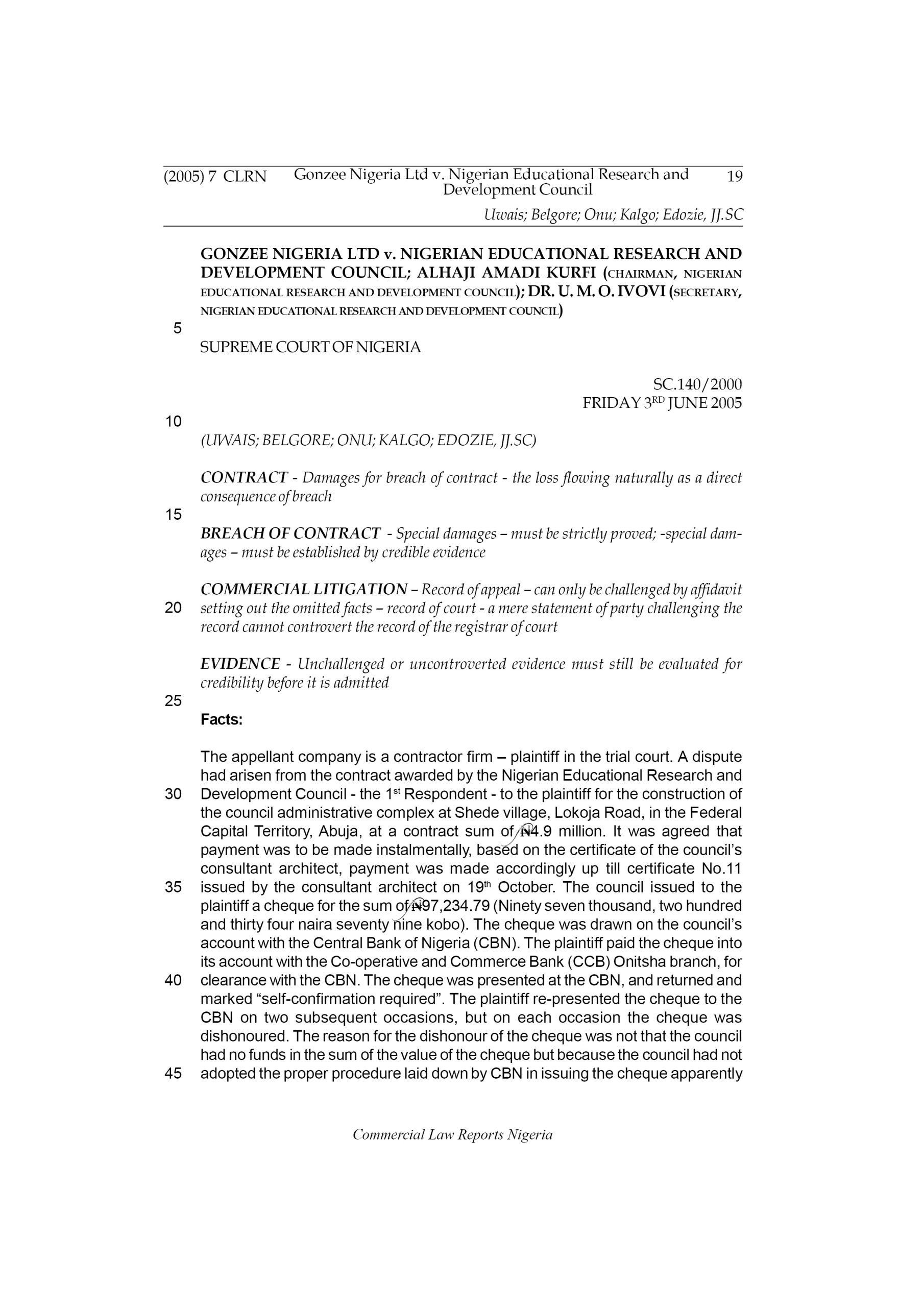 The appellant company is a contractor firm – plaintiff in the trial court. A dispute had arisen from the contract awarded by the Nigerian Educational Research and Development Council – the 1st Respondent – to the plaintiff for the construction of the council administrative complex at Shede village, Lokoja Road, in the Federal Capital Territory, Abuja, at a contract sum of N4.9 million. It was agreed that payment was to be made instalmentally, based on the certificate of the council’s consultant architect, payment was made accordingly up till certificate No.11 issued by the consultant architect on 19th October. The council issued to the plaintiff a cheque for the sum of N97,234.79 (Ninety-seven thousand, two hundred and thirty four naira seventy nine kobo). The cheque was drawn