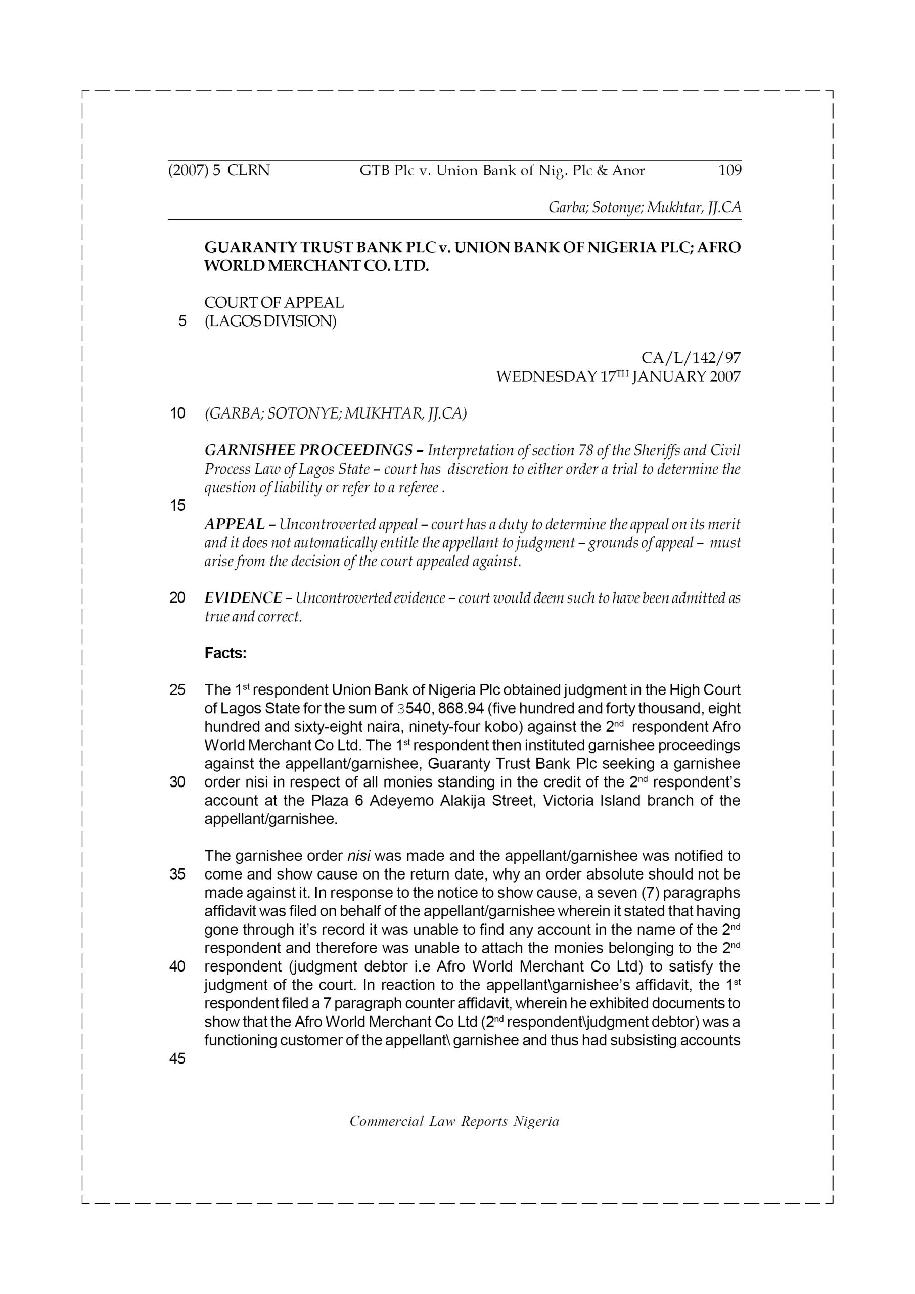 The 1st respondent Union Bank of Nigeria Plc obtained judgment in the High Court of Lagos State for the sum of N540,868.94 (five hundred and forty thousand, eight hundred and sixty-eight naira, ninety-four kobo) against the 2nd respondent Afro World Merchant Co Ltd. The 1st respondent then instituted garnishee proceedings against the appellant/garnishee, Guaranty Trust Bank Plc seeking a garnishee order nisi in respect of all monies standing in the credit of the 2nd respondent’s account at the Plaza 6 Adeyemo Alakija Street, Victoria Island branch of the appellant/garnishee.