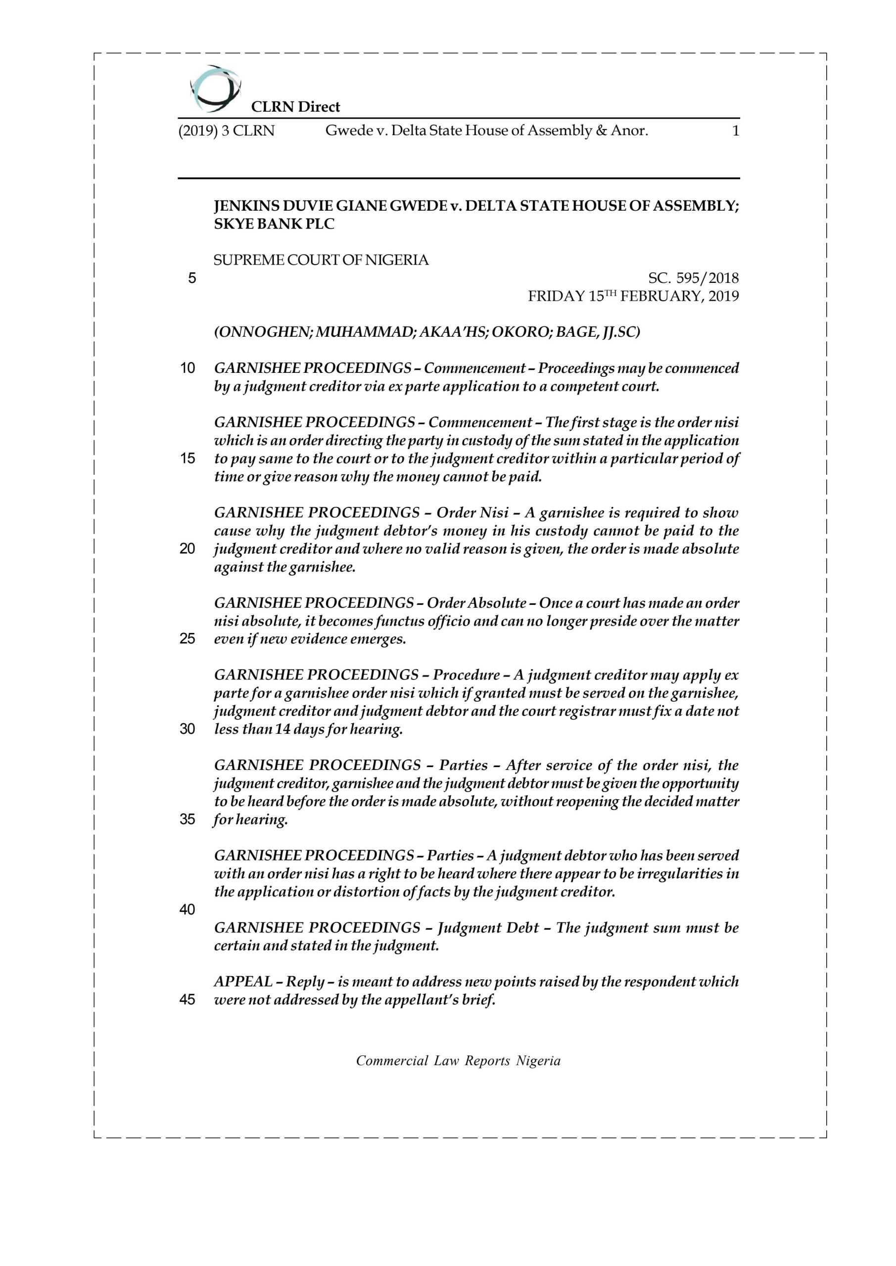 The Court heard the appeal and gave judgment in favour of the 1st respondent and set aside the ruling of the Federal High Court. The court held that the 1st respondent was not the appellant’s judgment debtor and that its liability only becomes enforceable when it receives the money from the removed member of the house and fails to pay same to the appellant. The court further held that since there was no evidence that the 1st respondent received any such money from the removed member of the House and refused to pay same to the appellant, the judgment debtor is the removed member of the House and not the 1st respondent. The appellant was dissatisfied with the judgment and consequently filed a notice of appeal at the Supreme Court of Nigeria, Abuja.