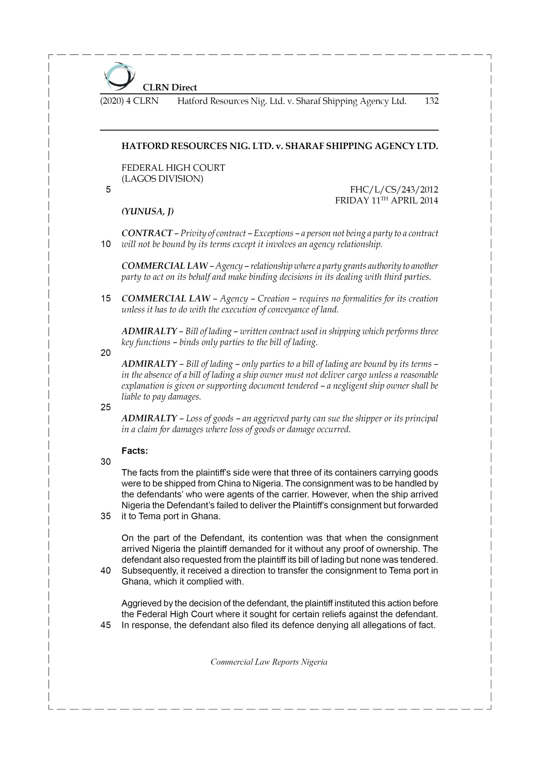 The facts from the plaintiff’s side were that three of its containers carrying goods were to be shipped from China to Nigeria. The consignment was to be handled by the defendants’ who were agents of the carrier. However, when the ship arrived Nigeria the Defendant’s failed to deliver the Plaintiff’s consignment but forwarded it to Tema port in Ghana. On the part of the Defendant, its contention was that when the consignment arrived Nigeria the plaintiff demanded for it without any proof of ownership.