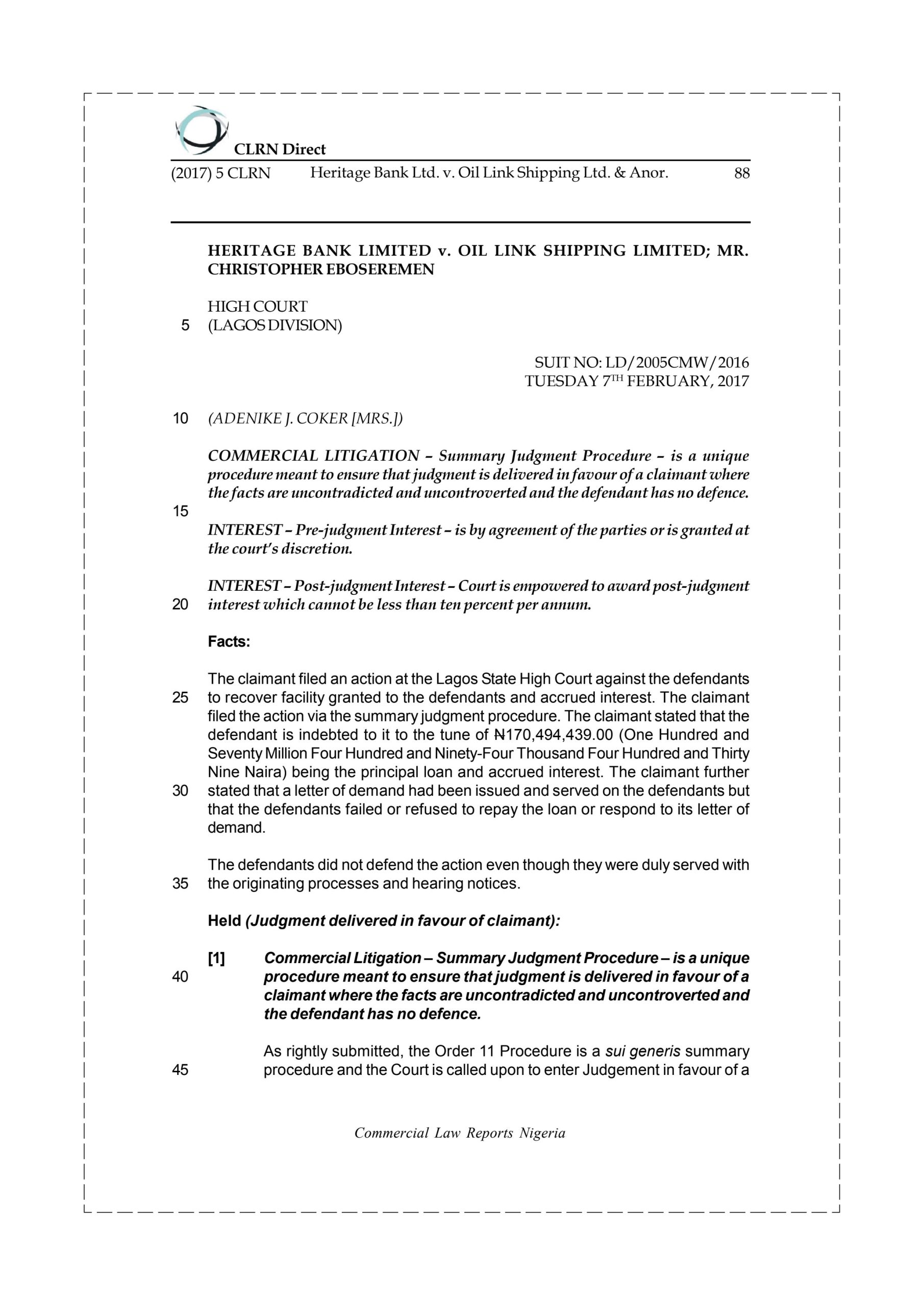 The claimant filed an action at the Lagos State High Court against the defendants to recover facility granted to the defendants and accrued interest. The claimant filed the action via the summary judgment procedure. The claimant stated that the defendant is indebted to it to the tune of N170,494,439.00 (One Hundred and Seventy Million Four Hundred and Ninety-Four Thousand Four Hundred and Thirty Nine Naira) being the principal loan and accrued interest. The claimant further stated that a letter of demand had been issued and served on the defendants but that the defendants failed or refused to repay the loan or respond to its letter of demand.