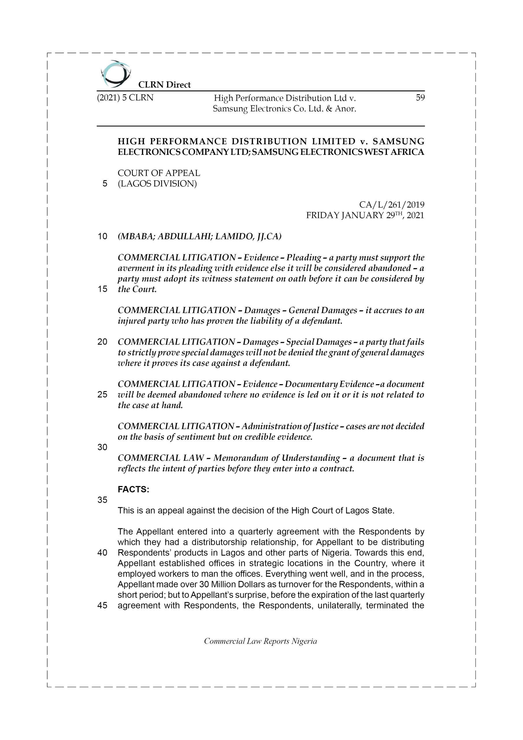 In its final judgment, the trial Court held that the denial of the relationship by the Respondents with Appellant was a white lie (that is false), and said that the 2nd Respondent had acted as agent of the 1st Respondent in the matter that brought about the suit. The Court further held that the supply of Samsung products to the Appellant by the 1st Respondent ceased on the termination of the M.O.U., executed between Appellant and the 2nd Respondent.