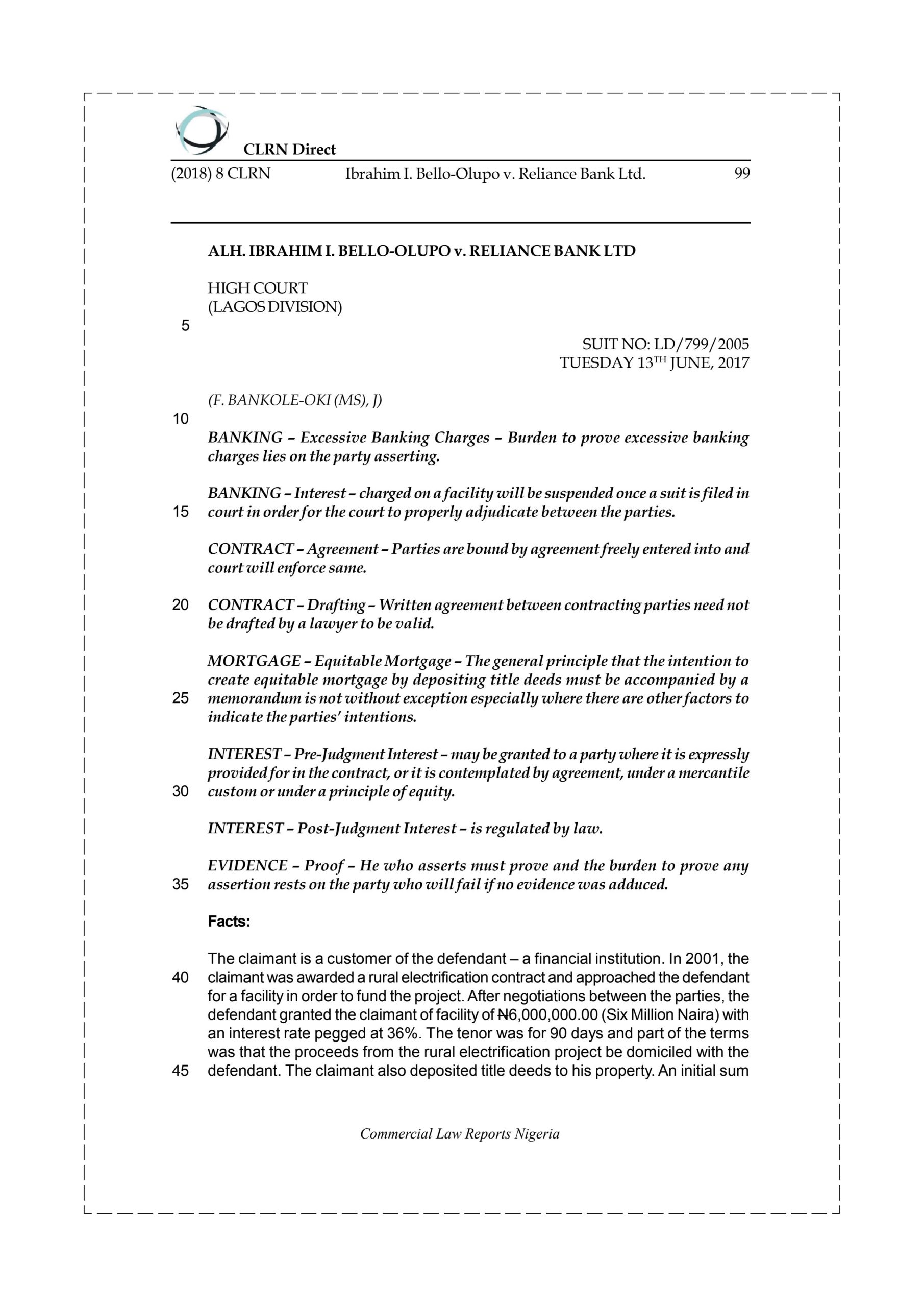 The claimant is a customer of the defendant – a financial institution. In 2001, the claimant was awarded a rural electrification contract and approached the defendant for a facility in order to fund the project. After negotiations between the parties, the defendant granted the claimant of facility of N6,000,000.00 (Six Million Naira) with an interest rate pegged at 36%. The tenor was for 90 days and part of the terms was that the proceeds from the rural electrification project be domiciled with the defendant. The claimant also deposited title deeds to his property. An initial sum of N6,000,000.00 (Six Million Naira) being the first proceeds of the project was lodged with the defendant before the facility was granted. The defendant failed to domicile the proceeds from the rural electrification project with the defendant after the facility was granted.