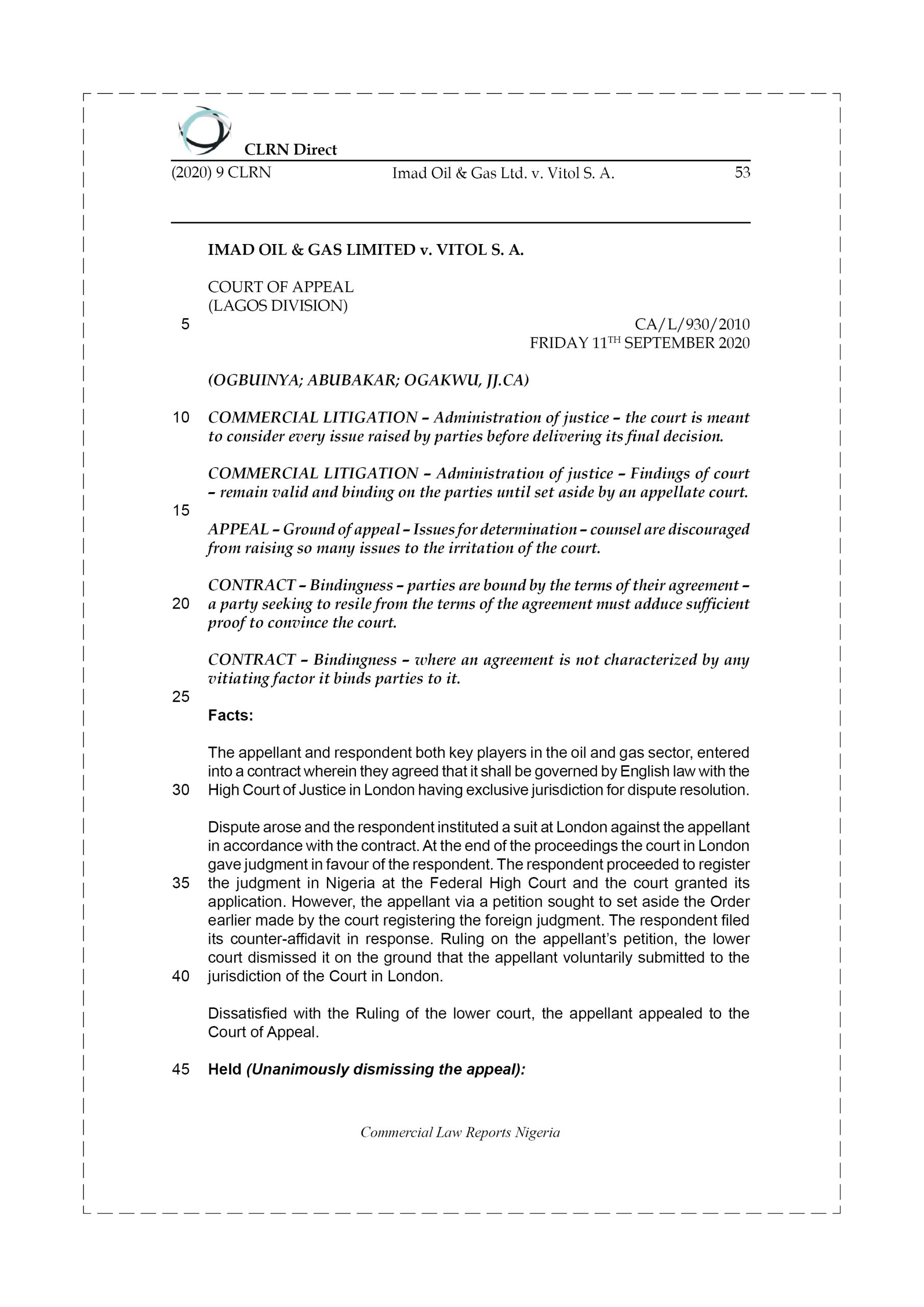 Dispute arose and the respondent instituted a suit at London against the appellant in accordance with the contract. At the end of the proceedings the court in London gave judgment in favour of the respondent. The respondent proceeded to register the judgment in Nigeria at the Federal High Court and the court granted its application. However, the appellant via a petition sought to set aside the Order earlier made by the court registering the foreign judgment. The respondent filed its counter-affidavit in response. Ruling on the appellant’s petition, the lower court dismissed it on the ground that the appellant voluntarily submitted to the jurisdiction of the Court in London.