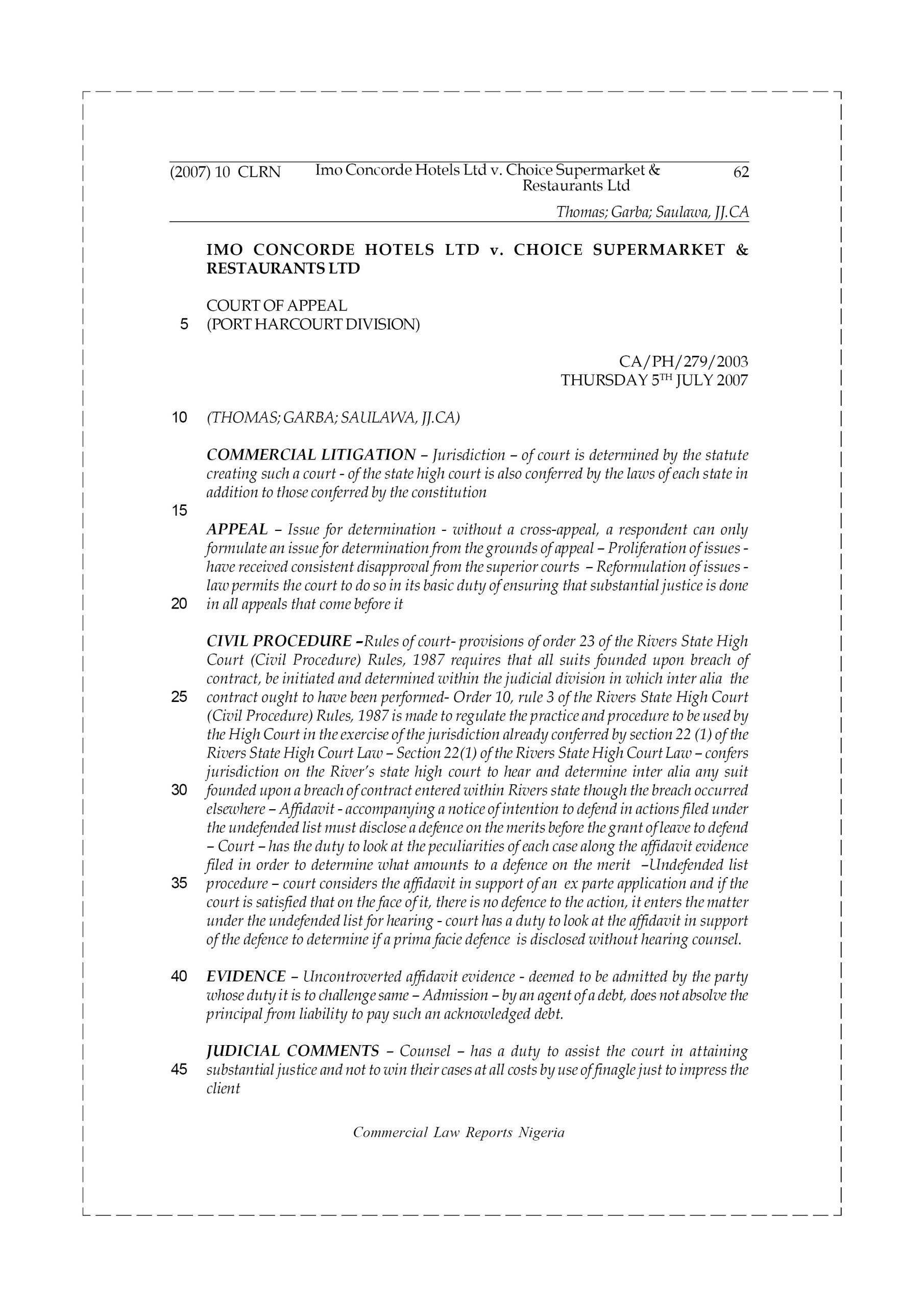In a ruling on the issue, the trial court decided that the appellant’s affidavit accompanying its notice of intention to defend did not disclose a defence on the merit and so entered judgment in favour of the respondent. Not satisfied with the judgment, the appellant appealed to the Court of Appeal, where the ruling of the lower court was unanimously upheld and the appeal dismissed.