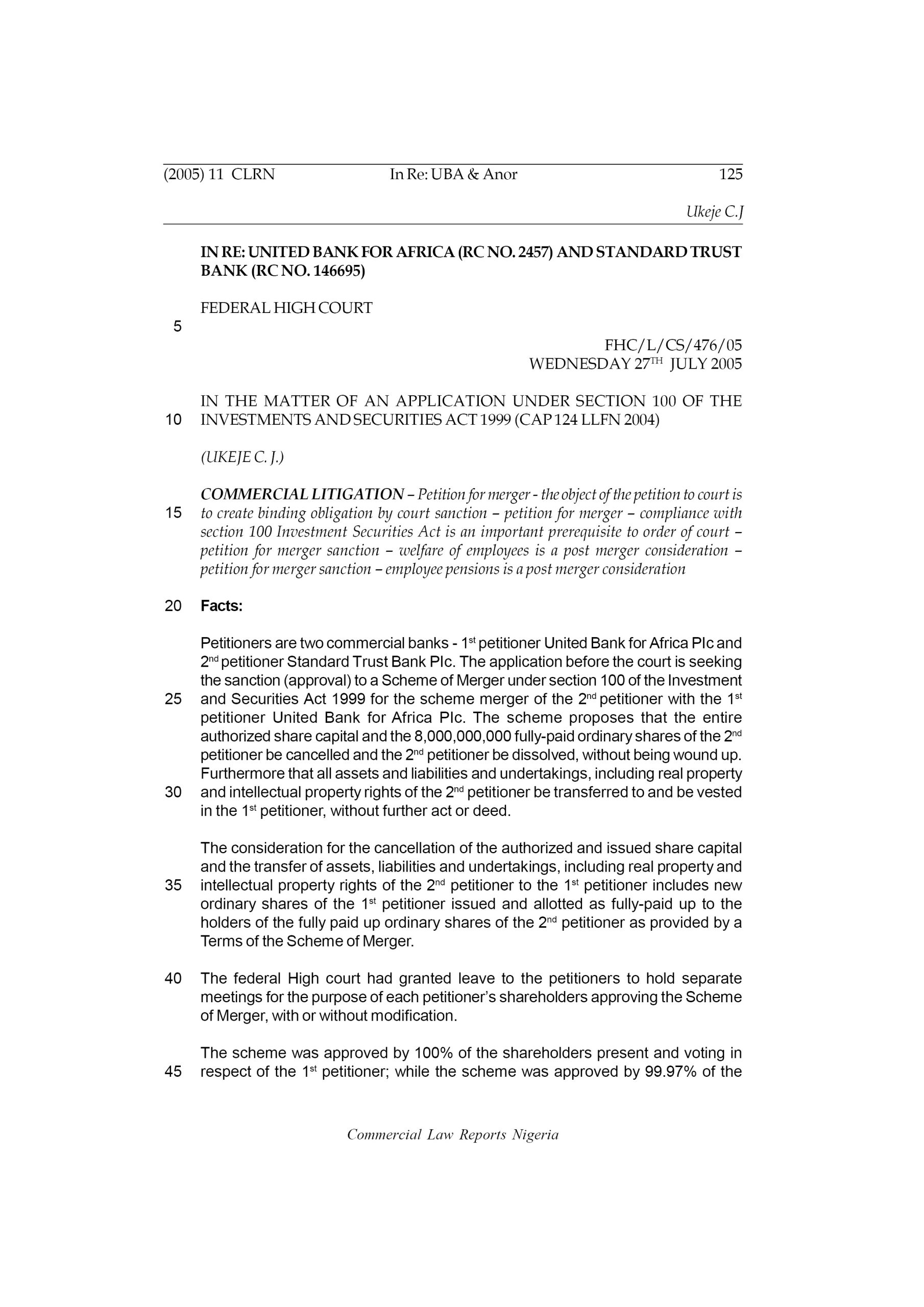 Petitioners are two commercial banks – 1st petitioner United Bank for Africa PIc and 2nd petitioner Standard Trust Bank PIc. The application before the court is seeking the sanction (approval) to a Scheme of Merger under section 100 of the Investment and Securities