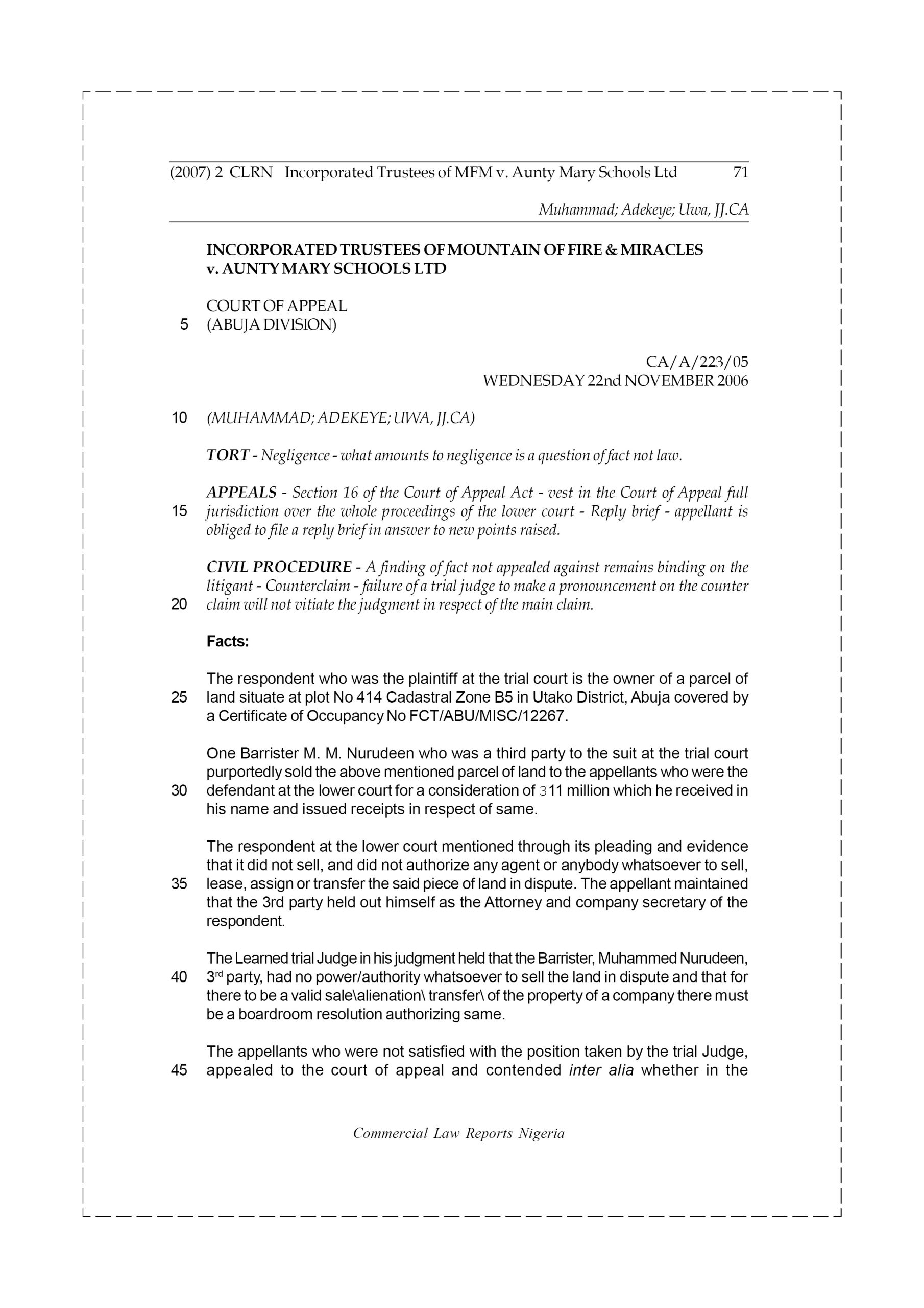 The respondent who was the plaintiff at the trial court is the owner of a parcel of land situate at plot No 414 Cadastral Zone B5 in Utako District, Abuja covered by a Certificate of Occupancy No FCT/ABU/MISC/12267.