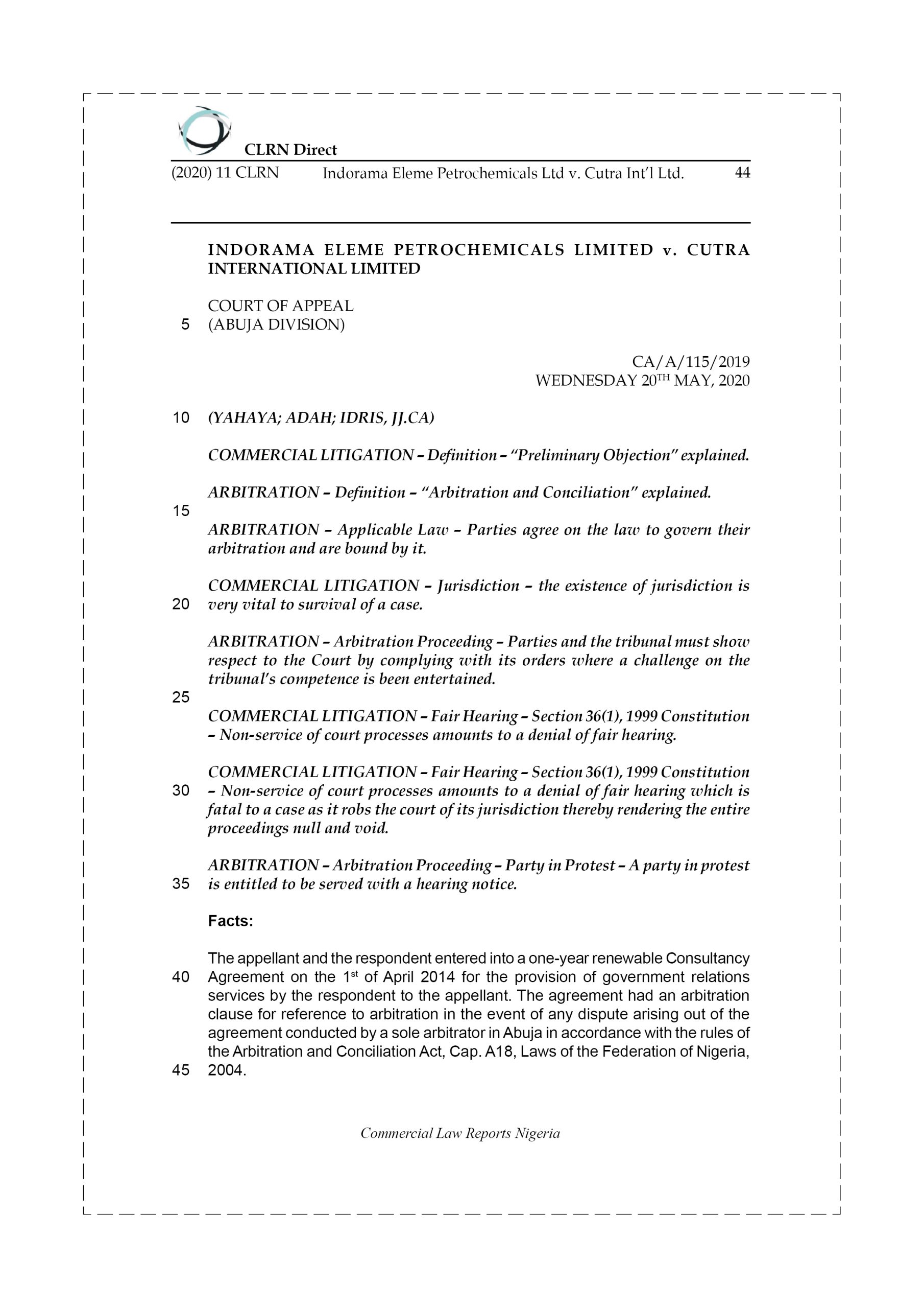 Dispute arose between the parties in relation to the agreement and on respondent’s application, the Chartered Institute of Arbitrators of Nigeria appointed a sole arbitrator. At the preliminary meetings of the arbitrator and the parties, the appellant challenged the competence of the arbitral proceedings and the jurisdiction of the arbitrator on the ground that the respondent failed to serve notice of arbitration on the appellant as required by the Arbitration and Conciliation Act. The arbitrator ruled that such hearing notice could be dispensed with by the parties under section 17 of the Arbitration and Conciliation Act.