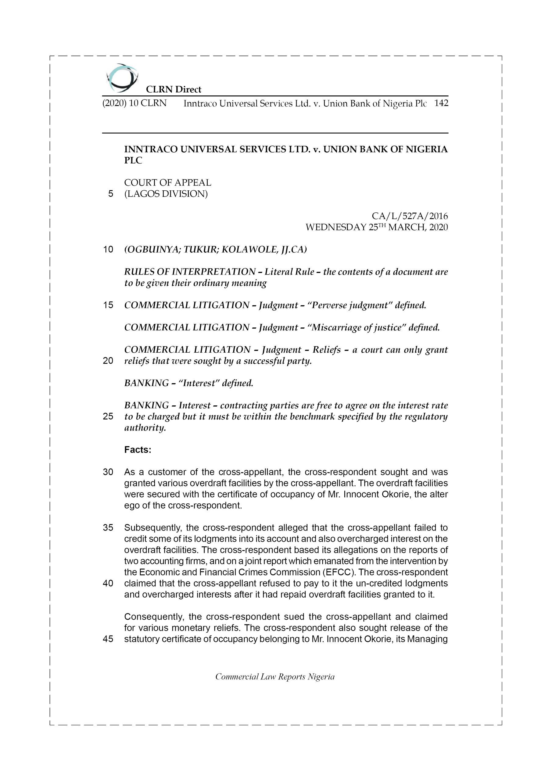 As a customer of the cross-appellant, the cross-respondent sought and was granted various overdraft facilities by the cross-appellant. The overdraft facilities were secured with the certificate of occupancy of Mr. Innocent Okorie, the alter ego of the cross-respondent.