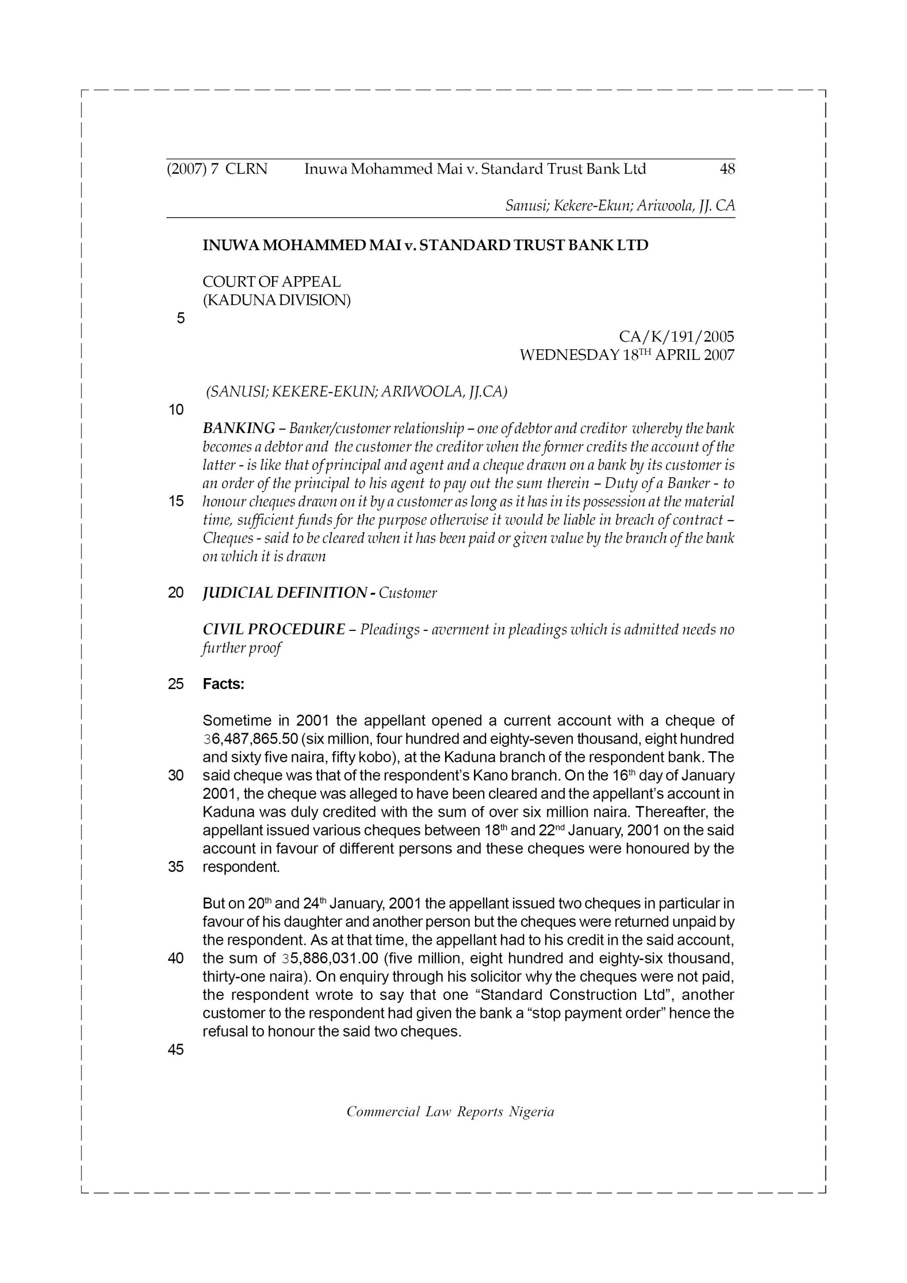 Sometime in 2001 the appellant opened a current account with a cheque of N6,487,865.50 (six million, four hundred and eighty-seven thousand, eight hundred and sixty five naira, fifty kobo), at the Kaduna branch of the respondent bank. The said cheque was that of the respondent’s Kano branch. On the 16th day of January 2001, the cheque was alleged to have been cleared and the appellant’s account in Kaduna was duly credited with the sum of over six million naira. Thereafter, the appellant issued various cheques between 18th and 22nd January, 2001 on the said account in favour of different persons and these cheques were honoured by the respondent