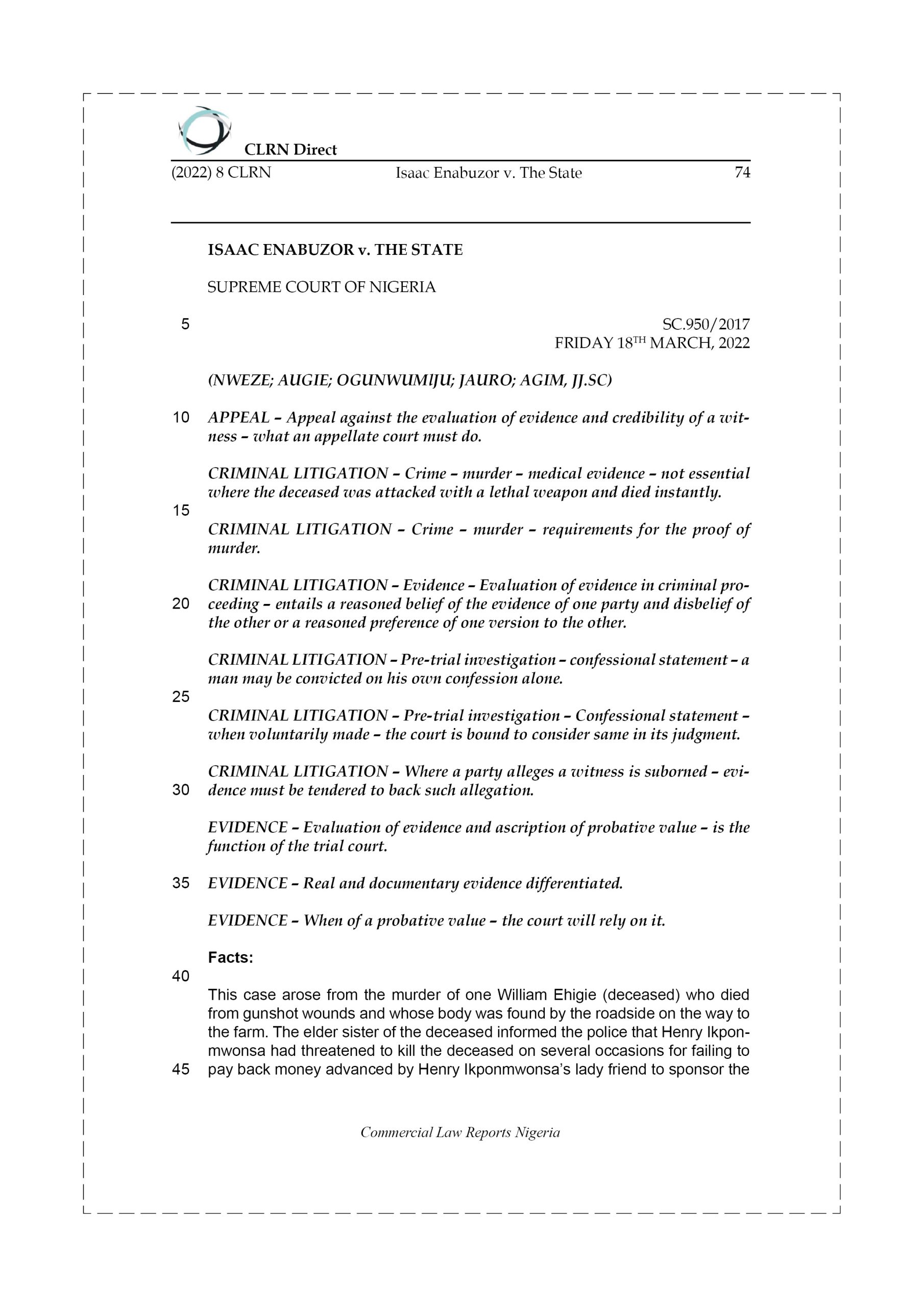 This case arose from the murder of one William Ehigie (deceased) who died from gunshot wounds and whose body was found by the roadside on the way to the farm. The elder sister of the deceased informed the police that Henry Ikponmwonsa had threatened to kill the deceased on several occasions for failing to pay back money advanced by Henry Ikponmwonsa’s lady friend to sponsor the deceased’s daughter to Spain. The Police was further informed that the threat was made during a family meeting which was called in an attempt to settle the quarrel between Henry Ikponmwonsa and the deceased by the Head of the family. The Police arrested Henry Ikponmwonsa who immediately confessed to the Police that he hired the Appellant to kill the deceased and that he gave money to the Appellant to buy cartridges to load in his gun; that Henry Ikponmwonsa and the Appellant went to wait for the deceased on a farm road and immediately they sighted the deceased, the Appellant shot at him, the bullet hit the deceased on his neck which made the deceased to fall down and Henry Ikponmwonsa stepped on his head to ensure that he was completely dead before they left the scene of crime. The Appellant was further arrested and arraigned before the High Court of Edo State, sitting at Benin City (trial Court), wherein was convicted for the offence of conspiracy to commit murder and murder and thereupon sentenced to death by hanging.