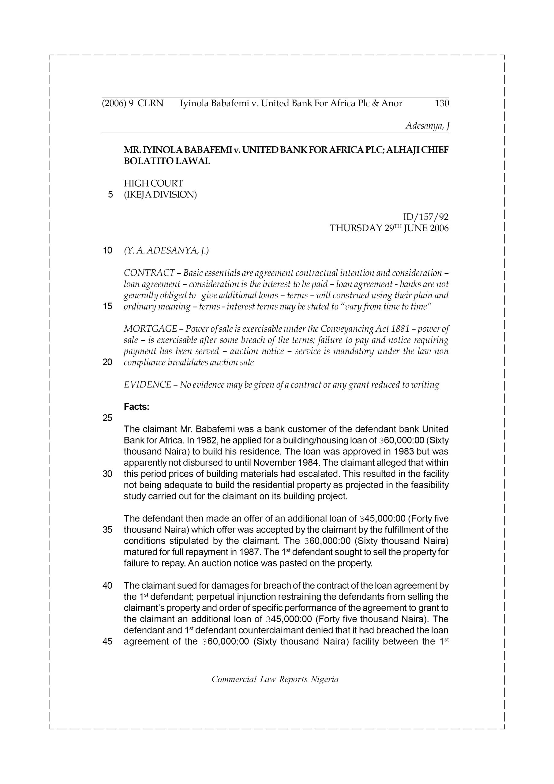 The claimant Mr. Babafemi was a bank customer of the defendant bank United Bank for Africa. In 1982, he applied for a building/housing loan of N60,000:00 (Sixty thousand Naira) to build his residence. The loan was approved in 1983 but was apparently not disbursed to until November 1984. The claimant alleged that within this period prices of building materials had escalated. This resulted in the facility not being adequate to build the residential property as projected in the feasibility study carried out for the claimant on its building project.