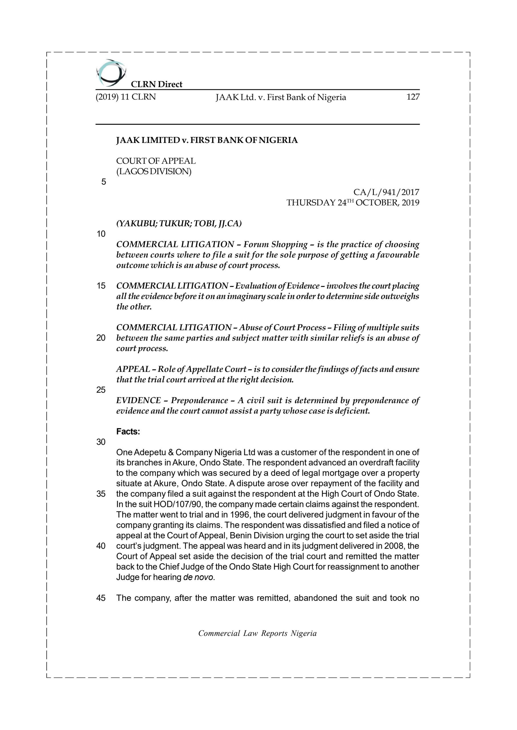 One Adepetu & Company Nigeria Ltd was a customer of the respondent in one of its branches in Akure, Ondo State. The respondent advanced an overdraft facility to the company which was secured by a deed of legal mortgage over a property situate at Akure, Ondo State. A dispute arose over repayment of the facility and the company filed a suit against the respondent at the High Court of Ondo State. In the suit HOD/107/90, the company made certain claims against the respondent. The matter went to trial and in 1996, the court delivered judgment in favour of the company granting its claims. The respondent was dissatisfied and filed a notice of appeal at the Court of Appeal, Benin Division urging the court to set aside the trial court’s judgment. The appeal was heard and in its judgment delivered in 2008, the Court of Appeal set aside the decision of the trial court and remitted the matter back to the Chief Judge of the Ondo State High Court for reassignment to another Judge for hearing de novo.