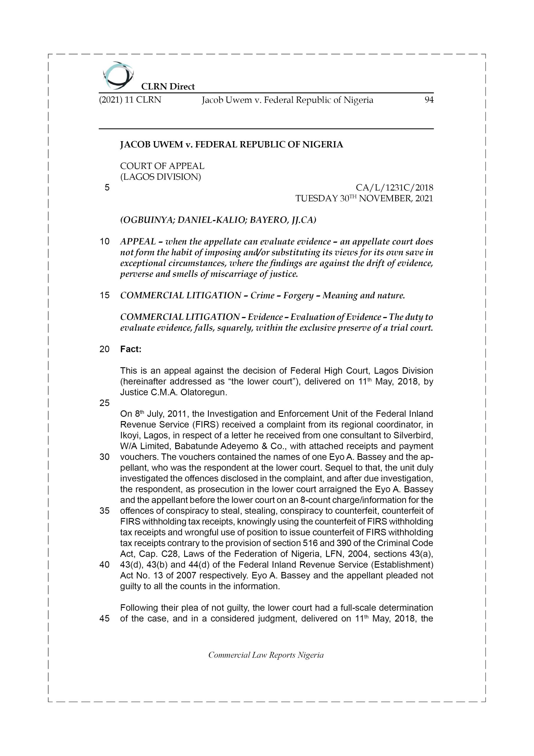 On 8th July, 2011, the Investigation and Enforcement Unit of the Federal Inland Revenue Service (FIRS) received a complaint from its regional coordinator, in Ikoyi, Lagos, in respect of a letter he received from one consultant to Silverbird, W/A Limited, Babatunde Adeyemo & Co., with attached receipts and payment vouchers. The vouchers contained the names of one Eyo A. Bassey and the appellant, who was the respondent at the lower court. Sequel to that, the unit duly investigated the offences disclosed in the complaint, and after due investigation, the respondent, as prosecution in the lower court arraigned the Eyo A. Bassey and the appellant before the lower court on an 8-count charge/information for the offences of conspiracy to steal, stealing, conspiracy to counterfeit, counterfeit of FIRS withholding tax receipts, knowingly using the counterfeit of FIRS withholding tax receipts and wrongful use of position to issue counterfeit of FIRS withholding tax receipts contrary to the provision of section 516 and 390 of the Criminal Code Act, Cap. C28, Laws of the Federation of Nigeria, LFN, 2004, sections 43(a), 43(d), 43(b) and 44(d) of the Federal Inland Revenue Service (Establishment) Act No. 13 of 2007 respectively. Eyo A. Bassey and the appellant pleaded not guilty to all the counts in the information.