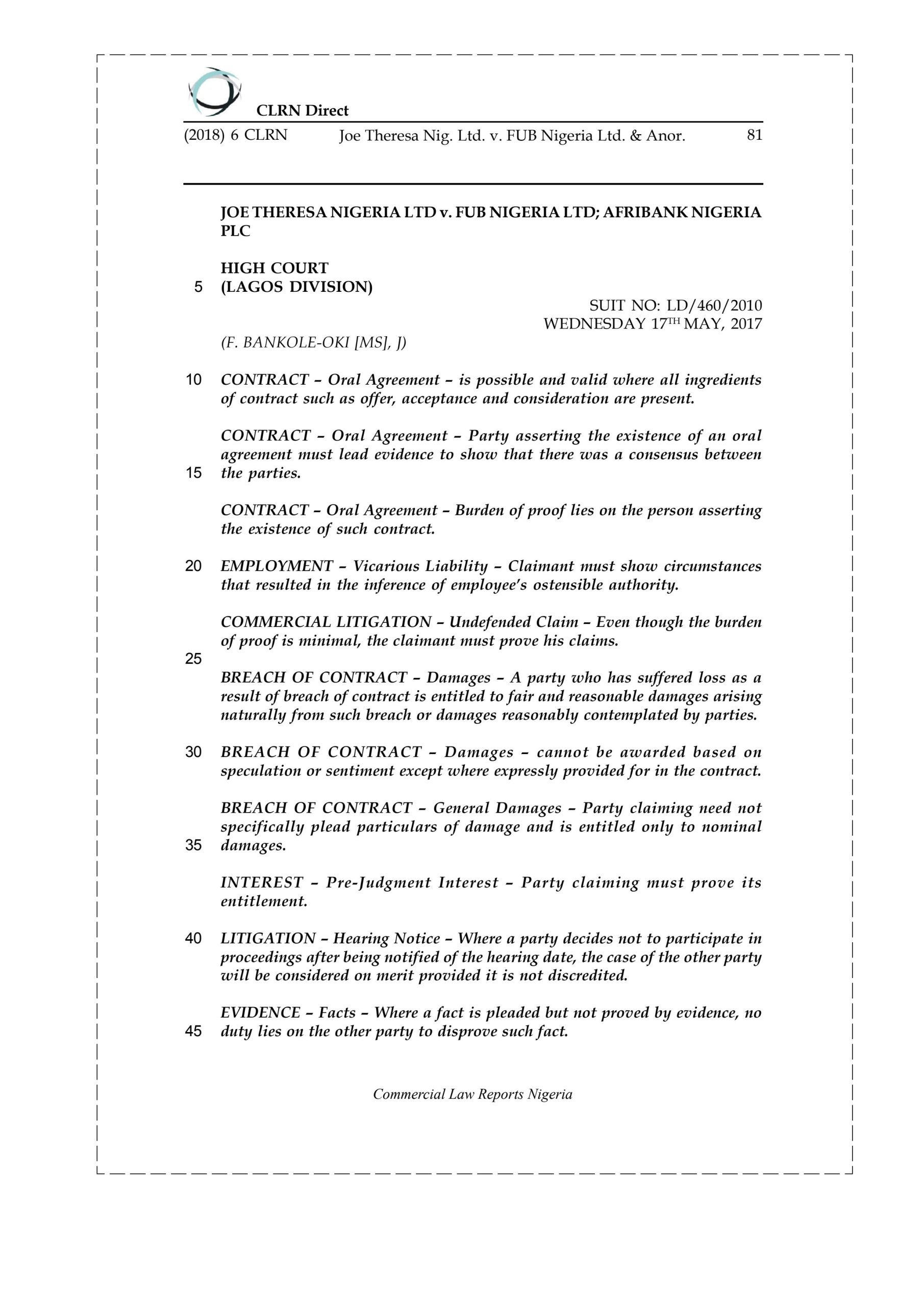 The claimant is in the business of clearing and forwarding. The 2nd defendant is a banking institution. The claimant alleged that sometime in 2008, its managing director applied to the 2nd defendant to be retained as its clearing and forwarding agent and that this request was granted. Consequent upon this approval, the claimant alleged that it performed several clearing and forwarding operations for the 2nd defendant. The claimant further alleged that sometime in 2009, the managing director of one of the branches of the 2nd defendant orally entered into an agreement with it to clear the goods of the 1st defendant who was a customer of the 2nd defendant who had guaranteed payment of the loan for the shipped goods. The consignment consisted of 21 truck heads and 25 tanks for which the