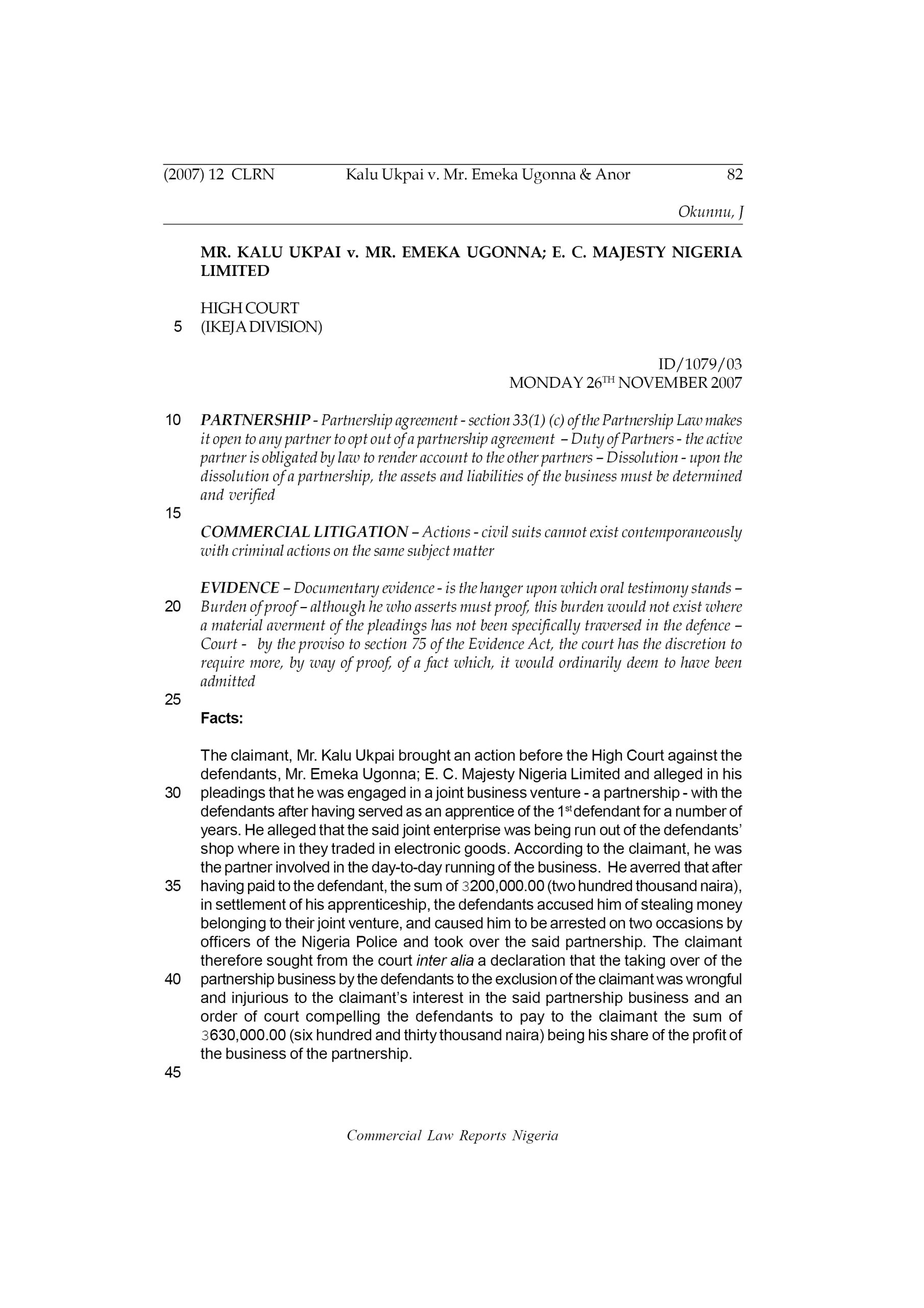 The claimant, Mr. Kalu Ukpai brought an action before the High Court against the defendants, Mr. Emeka Ugonna; E. C. Majesty Nigeria Limited and alleged in his pleadings that he was engaged in a joint business venture – a partnership – with the defendants after having served as an apprentice of the 1st defendant for a number of years. He alleged that the said joint enterprise was being run out of the defendants’ shop where in they traded in electronic goods. According to the claimant, he was the partner involved in the day-to-day running of the business. He averred that after having paid to the defendant, the sum of N200,000.00 (two hundred thousand naira),