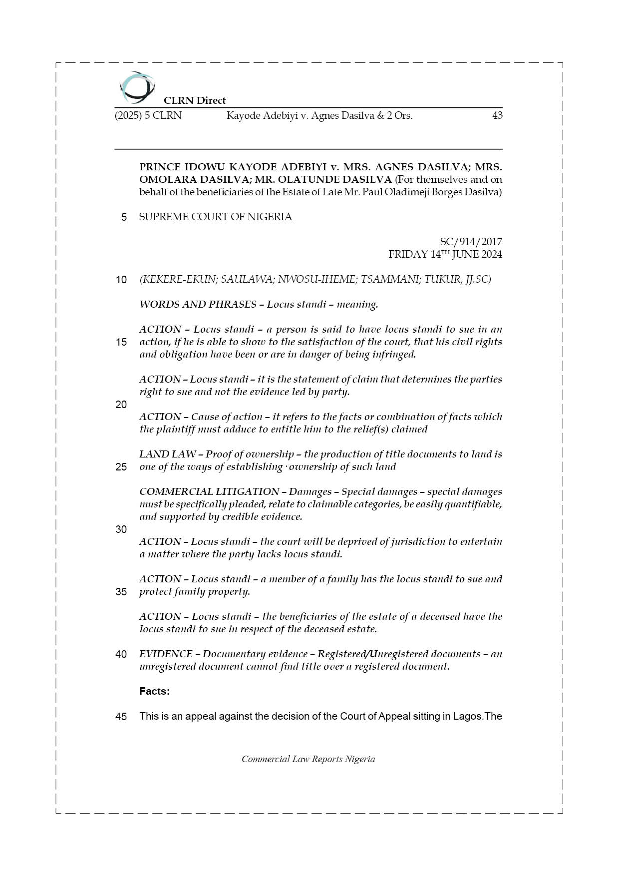 This is an appeal against the decision of the Court of Appeal sitting in Lagos. The Respondents in this case are the wife and children of Mr. Paul Oladimeji Borges Dasilva, the deceased owner of the disputed land. Mr. Dasilva died intestate, and the Respondents commenced an action against the Appellant at the High Court of Lagos State for trespass to land by the Appellants and for declaration that they are the owners of the disputed land having inherited it from the deceased Mr. Dasilva.