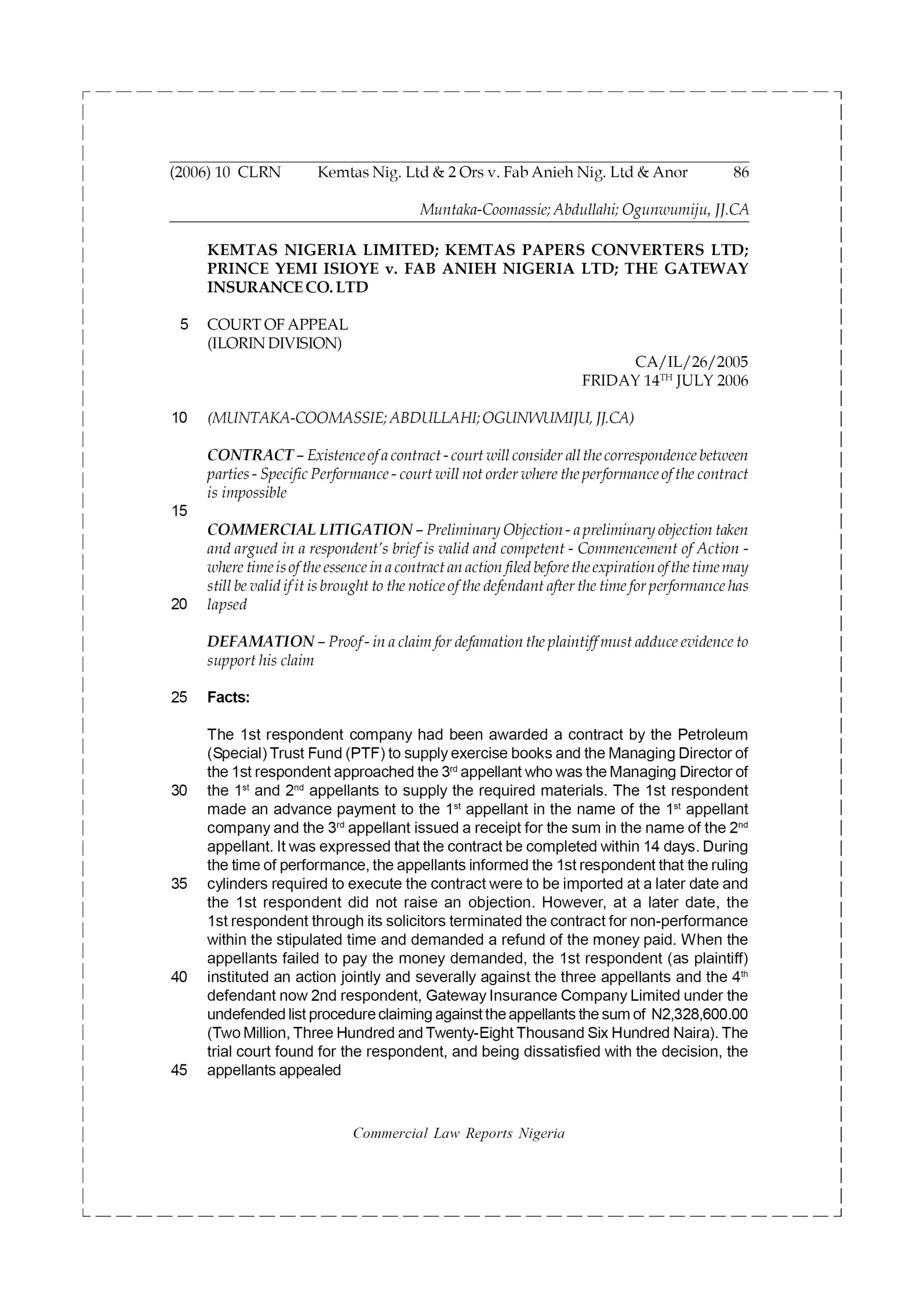 The 1st respondent company had been awarded a contract by the Petroleum (Special) Trust Fund (PTF) to supply exercise books and the Managing Director of the 1st respondent approached the 3rd appellant who was the Managing Director of the 1st and 2nd appellants to supply the required materials. The 1st respondent made an advance payment to the 1st appellant in the name of the 1st appellant company and the 3rd appellant issued a receipt for the sum in the name of the 2nd appellant. It was expressed that the contract be completed within 14 days. During the time of performance, the appellants informed the 1st respondent that the ruling cylinders required to execute the contract were to be imported at a later date and the 1st respondent did not raise an objection. However, at a later date, the 1st respondent through its solicitors terminated the contract for non-performance within the stipulated time and demanded a refund of the money paid. When the appellants failed to pay the money demanded, the 1st respondent (as plaintiff) instituted an action jointly and severally against the three appellants and the 4th defendant now 2nd respondent, Gateway Insurance Company Limited under the undefended list procedure claiming against the appellants the sum of N2,328,600.00 (Two Million, Three Hundred and Twenty-Eight Thousand Six Hundred Naira). The trial court found for the respondent, and being dissatisfied with the decision, the appellants appealed
