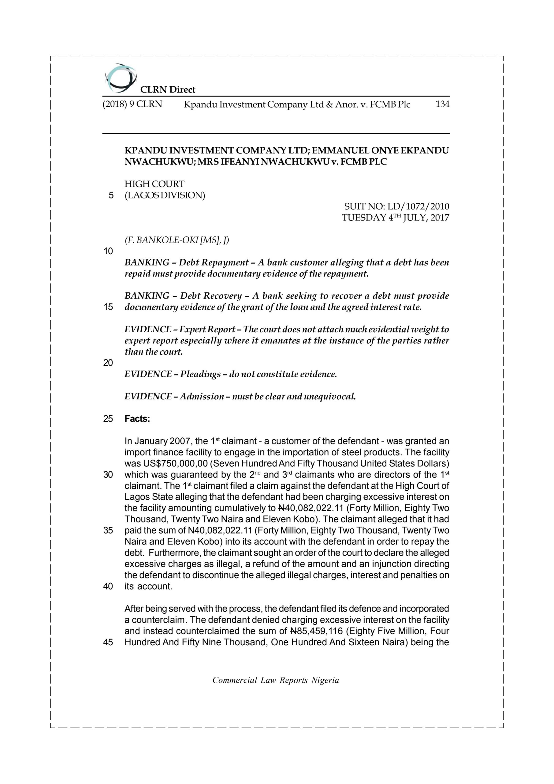 In January 2007, the 1st claimant – a customer of the defendant – was granted an import finance facility to engage in the importation of steel products. The facility was US$750,000,00 (Seven Hundred And Fifty Thousand United States Dollars) which was guaranteed by the 2nd and 3rd claimants who are directors of the 1st claimant. The 1st claimant filed a claim against the defendant at the High Court of Lagos State alleging that the defendant had been charging excessive interest on the facility amounting cumulatively to N40,082,022.11 (Forty Million, Eighty Two Thousand, Twenty Two Naira and Eleven Kobo). The claimant alleged that it had paid the sum of N40,082,022.11 (Forty Million, Eighty Two Thousand, Twenty Two Naira and Eleven Kobo) into its account with the defendant in order to repay the debt.