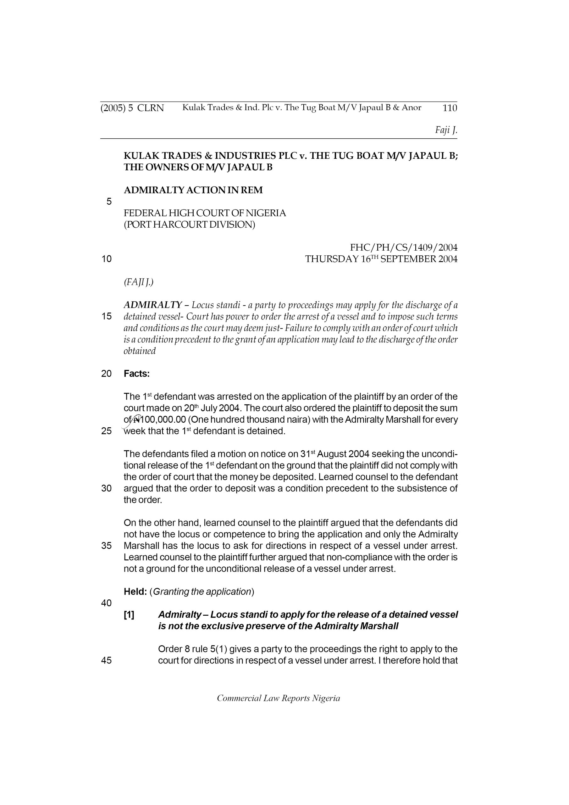 The 1st defendant was arrested on the application of the plaintiff by an order of the court made on 20th July 2004. The court also ordered the plaintiff to deposit the sum of N100,000.00 (One hundred thousand naira) with the Admiralty Marshall for every week that the 1st defendant is detained.