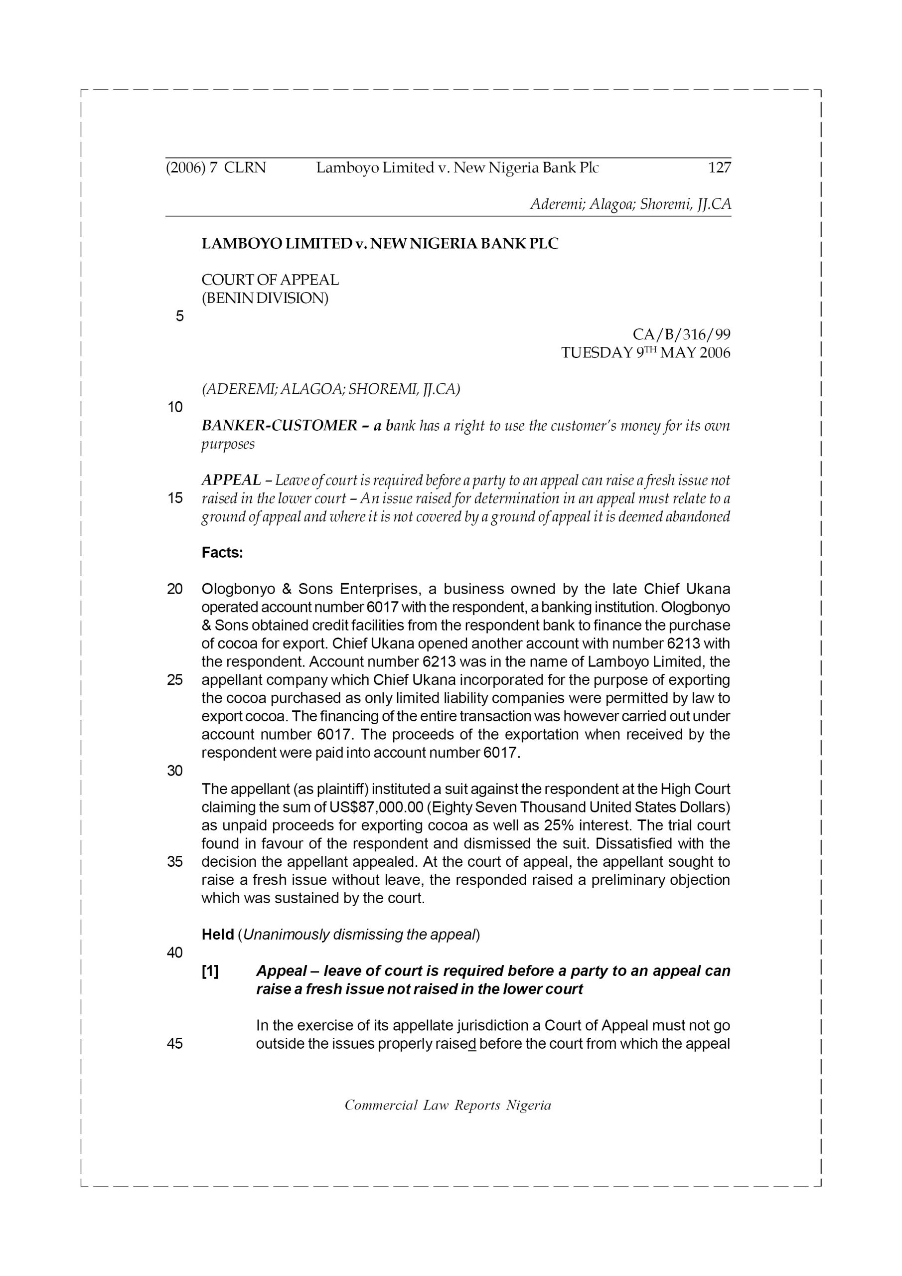 Ologbonyo & Sons Enterprises, a business owned by the late Chief Ukana operated account number 6017 with the respondent, a banking institution. Ologbonyo & Sons obtained credit facilities from the respondent bank to finance the purchase of cocoa for export. Chief Ukana opened another account with number 6213 with the respondent. Account number 6213 was in the name of Lamboyo Limited, the appellant company which Chief Ukana incorporated for the purpose of exporting the cocoa purchased as only limited liability companies were permitted by law to export cocoa. The financing of the entire transaction was however carried out under account number 6017. The proceeds of the exportation when received by the respondent were paid into account number 6017.