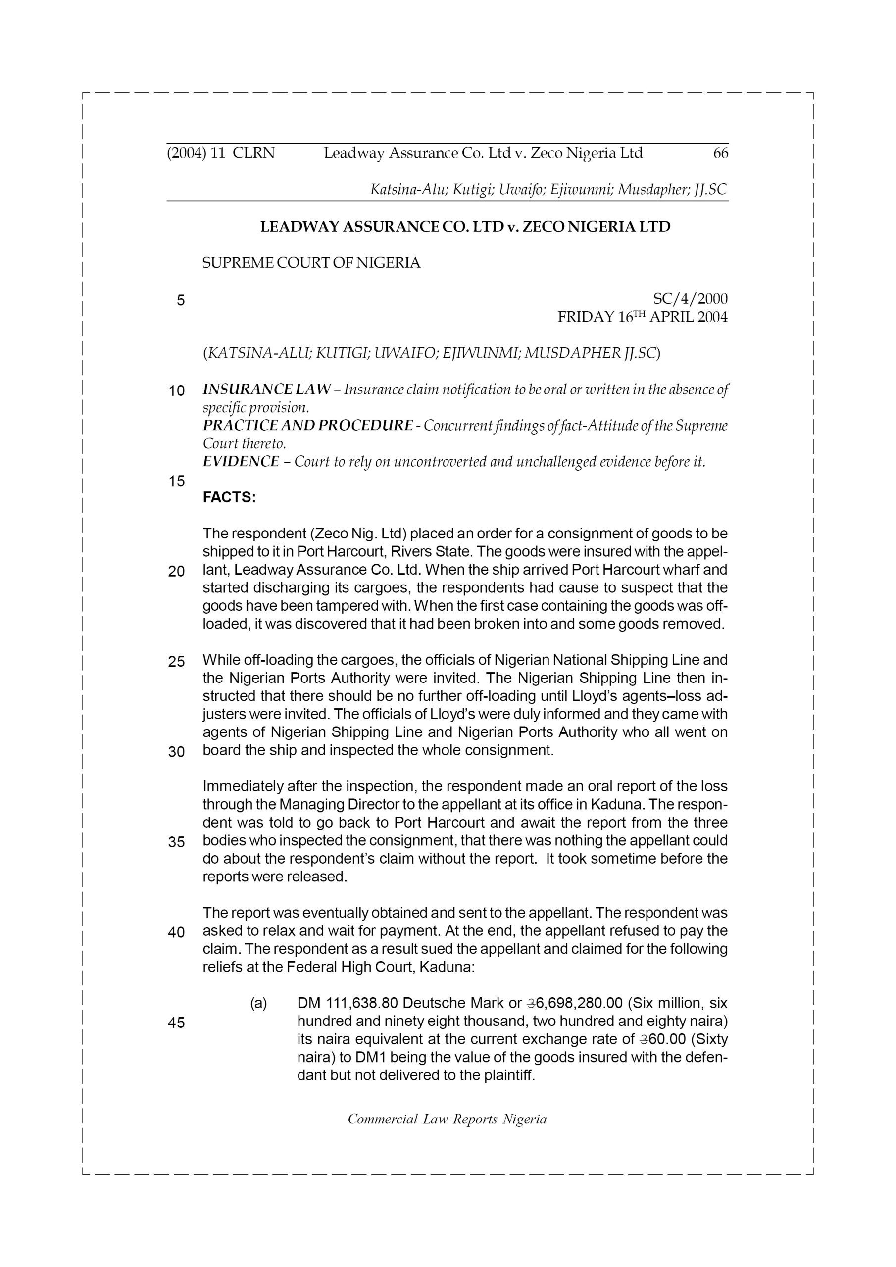 The respondent (Zeco Nig. Ltd) placed an order for a consignment of goods to be shipped to it in Port Harcourt, Rivers State. The goods were insured with the appellant, Leadway Assurance Co. Ltd. When the ship arrived Port Harcourt wharf and started discharging its cargoes, the respondents had cause to suspect that the goods have been tampered with. When the first case containing the goods was off loaded, it was discovered that it had been broken into and some goods removed.