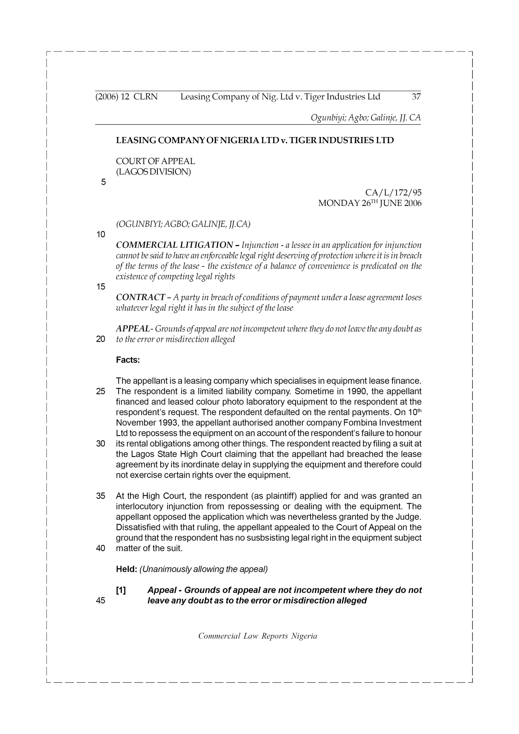 The appellant is a leasing company which specialises in equipment lease finance. The respondent is a limited liability company. Sometime in 1990, the appellant financed and leased colour photo laboratory equipment to the respondent at the respondent’s request. The respondent defaulted on the rental payments. On 10th November 1993, the appellant authorised another company Fombina Investment Ltd to repossess the equipment on an account of the respondent’s failure to honour its rental obligations among other things. The respondent reacted by filing a suit at the Lagos State High Court claiming that the appellant had breached the lease agreement by its inordinate delay in supplying the equipment and therefore could not exercise certain rights over the equipment.