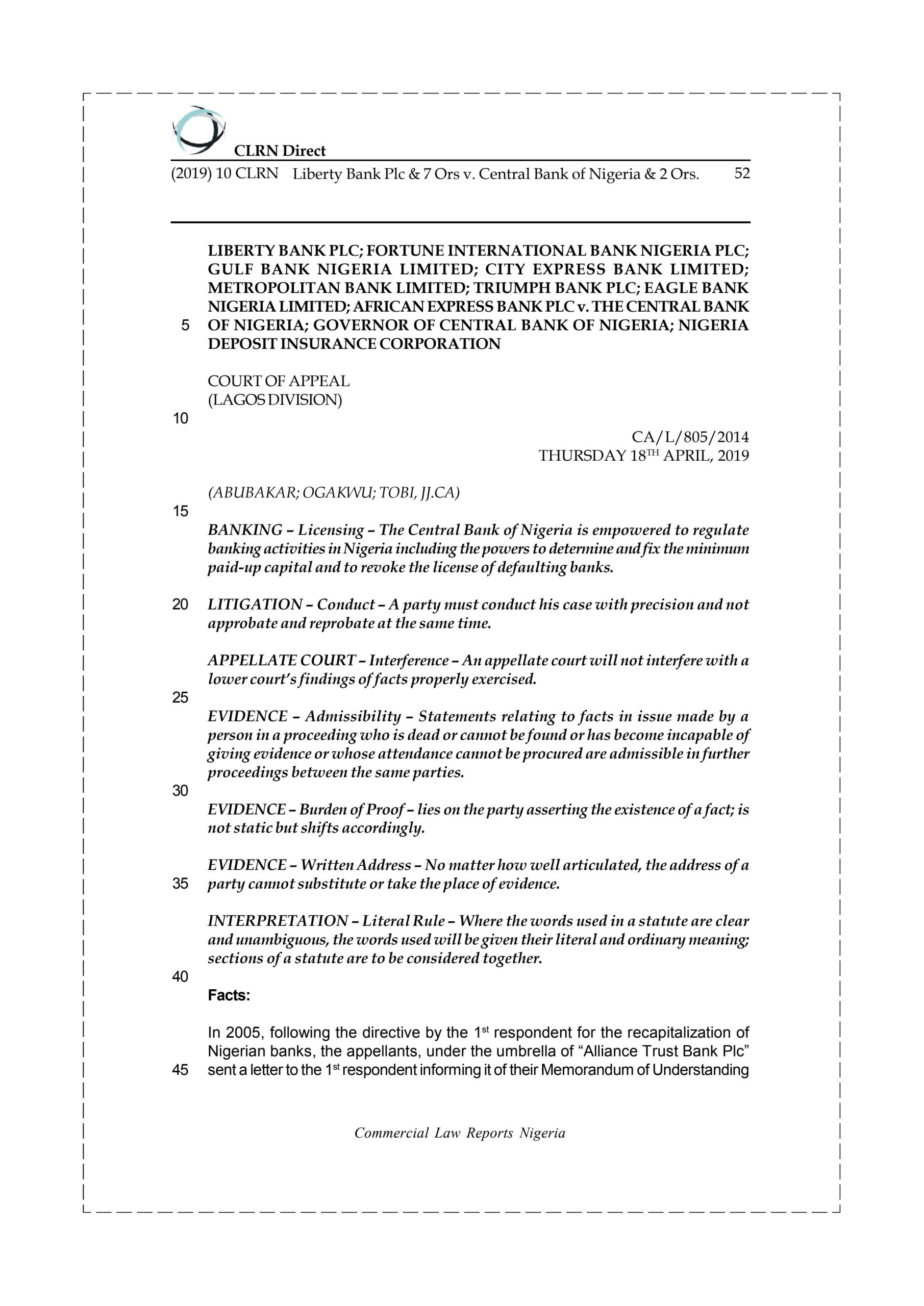 The 1st respondent alleged that one of the banks, the 8th appellant failed to deposit its banking license with the 1st respondent. Furthermore, the 1st respondent stated in the letter that the appellants failed to escrow the agreed N10,500,000,000.00 (Ten Billion, Five Hundred Million Naira) insider credit with it and that the lists of proposed board members consisted of persons unfit for such appointments who had been involved in running the banks aground. On the basis of these reasons, the 1st respondent revoked the license and brought the merger exercise to a close. The appellants were aggrieved and filed a suit against the respondents at the Federal High Court, Lagos Division seeking declarative and injunctive reliefs. The appellants made an allegation of discrimination, bias and bad faith against the 1st and 2nd respondents in the exercise of their powers. The matter went to trial and the matter was at the stage of adoption of written addresses when the trial judge recused himself. Another judge took over the matter and parties agreed to adopt their written addresses and continue with proceedings. At the end of trial, the court dismissed the claims of the appellants on the ground that they lacked merit.
