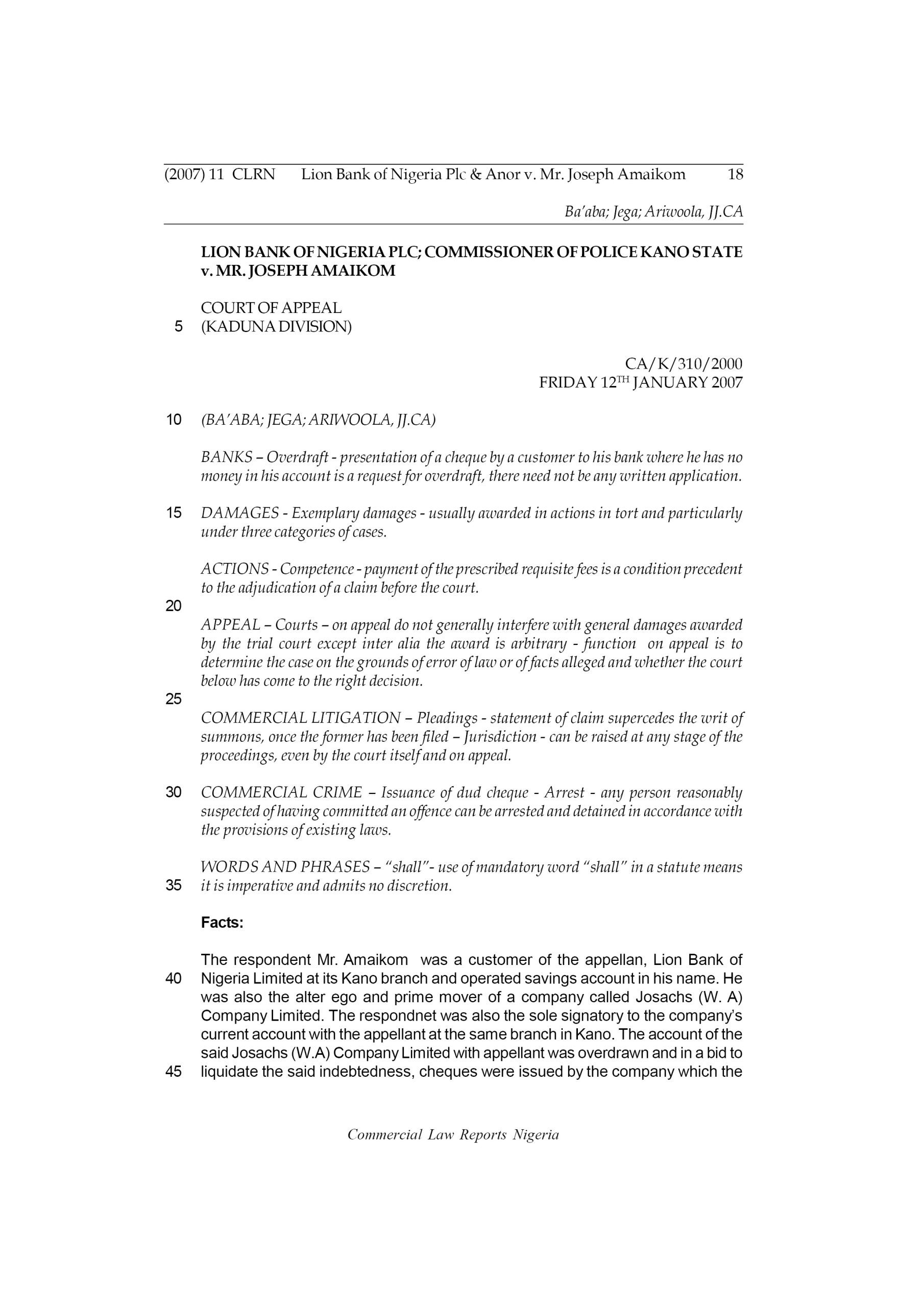 The respondent Mr. Amaikom was a customer of the appellan, Lion Bank of Nigeria Limited at its Kano branch and operated savings account in his name. He was also the alter ego and prime mover of a company called Josachs (W. A) Company Limited. The respondnet was also the sole signatory to the company’s current account with the appellant at the same branch in Kano. The account of the said Josachs (W.A) Company Limited with appellant was overdrawn and in a bid to liquidate the said indebtedness, cheques were issued by the company which the respondent signed but which were returned unpaid.