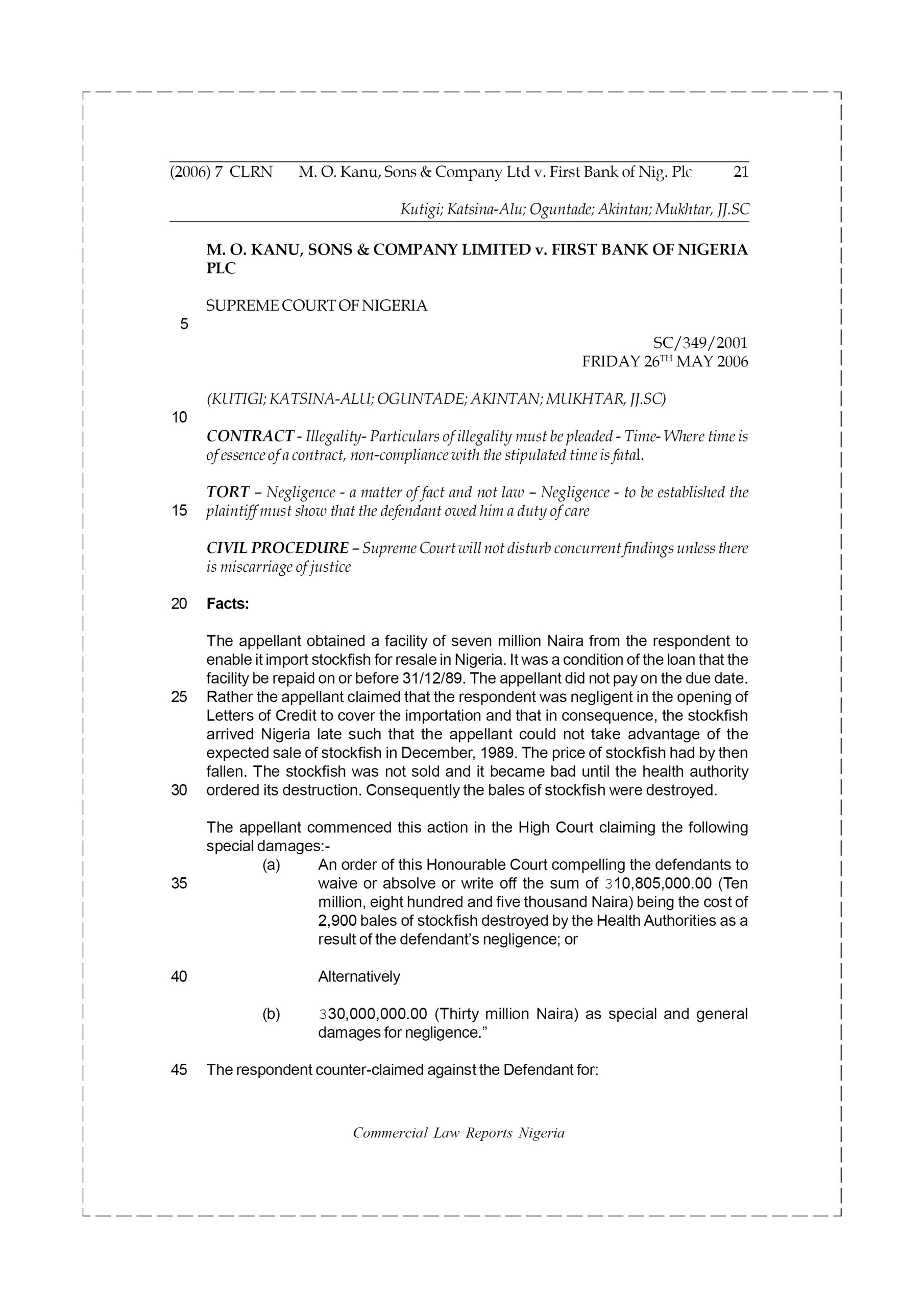 The appellant obtained a facility of seven million Naira from the respondent to enable it import stockfish for resale in Nigeria. It was a condition of the loan that the facility be repaid on or before 31/12/89. The appellant did not pay on the due date. Rather the appellant claimed that the respondent was negligent in the opening of Letters of Credit to cover the importation and that in consequence, the stockfish arrived Nigeria late such that the appellant could not take advantage of the expected sale of stockfish in December, 1989. The price of stockfish had by then fallen. The stockfish was not sold and it became bad until the health authority ordered its destruction. Consequently, the bales of stockfish were destroyed.