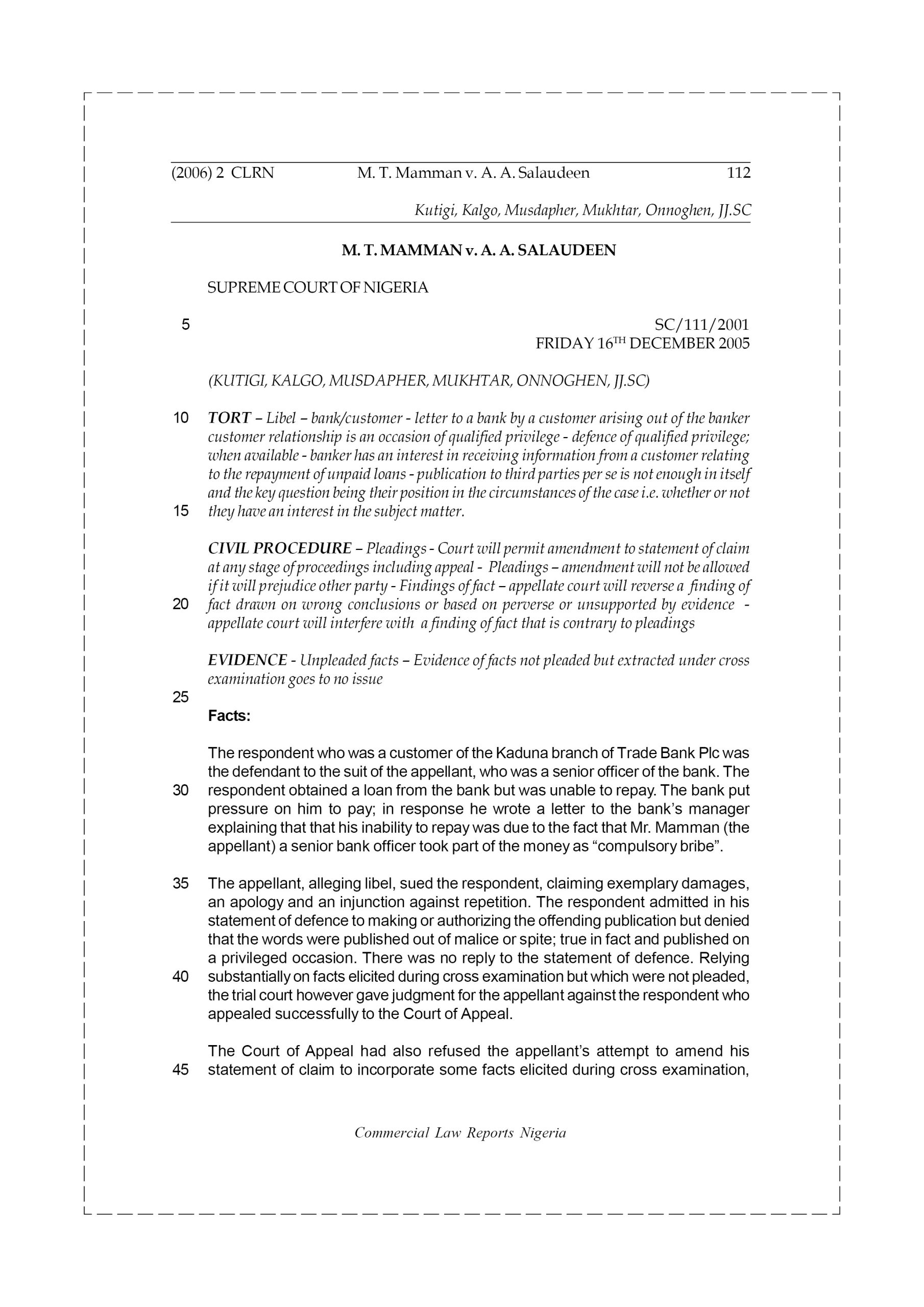 The respondent who was a customer of the Kaduna branch of Trade Bank Plc was the defendant to the suit of the appellant, who was a senior officer of the bank. The respondent obtained a loan from the bank but was unable to repay. The bank put pressure on him to pay; in response, he wrote a letter to the bank’s manager explaining that his inability to repay was because Mr. Mamman (the appellant) a senior bank officer, took part of the money as a “compulsory bribe”.