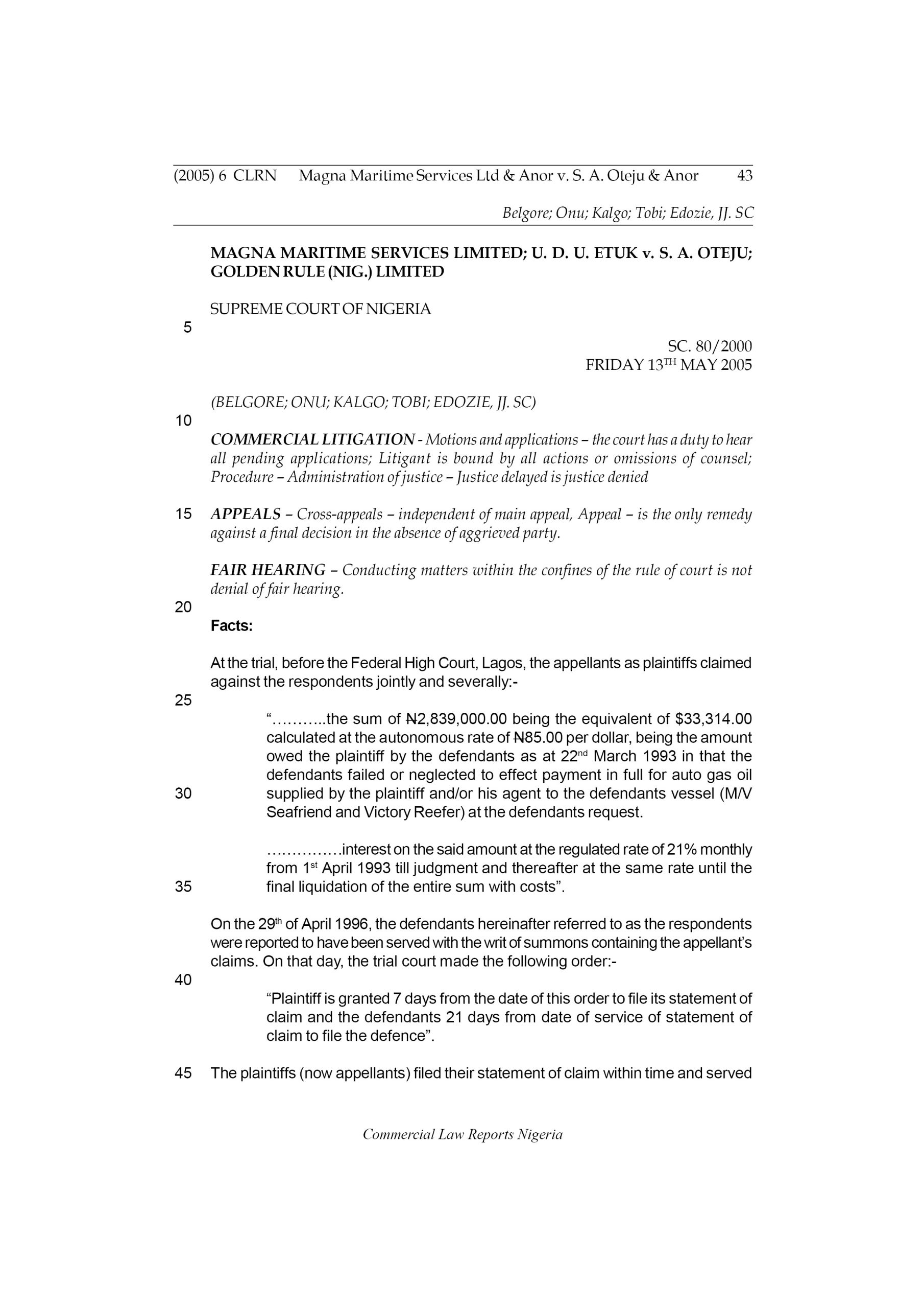 “………..the sum of N2,839,000.00 being the equivalent of $33,314.00 calculated at the autonomous rate of N85.00 per dollar, being the amount owed the plaintiff by the defendants as at 22nd March 1993 in that the defendants failed or neglected to effect payment in full for auto gas oil supplied by the plaintiff and/or his agent to the defendants vessel (M/V Seafriend and Victory Reefer) at the defendants request.