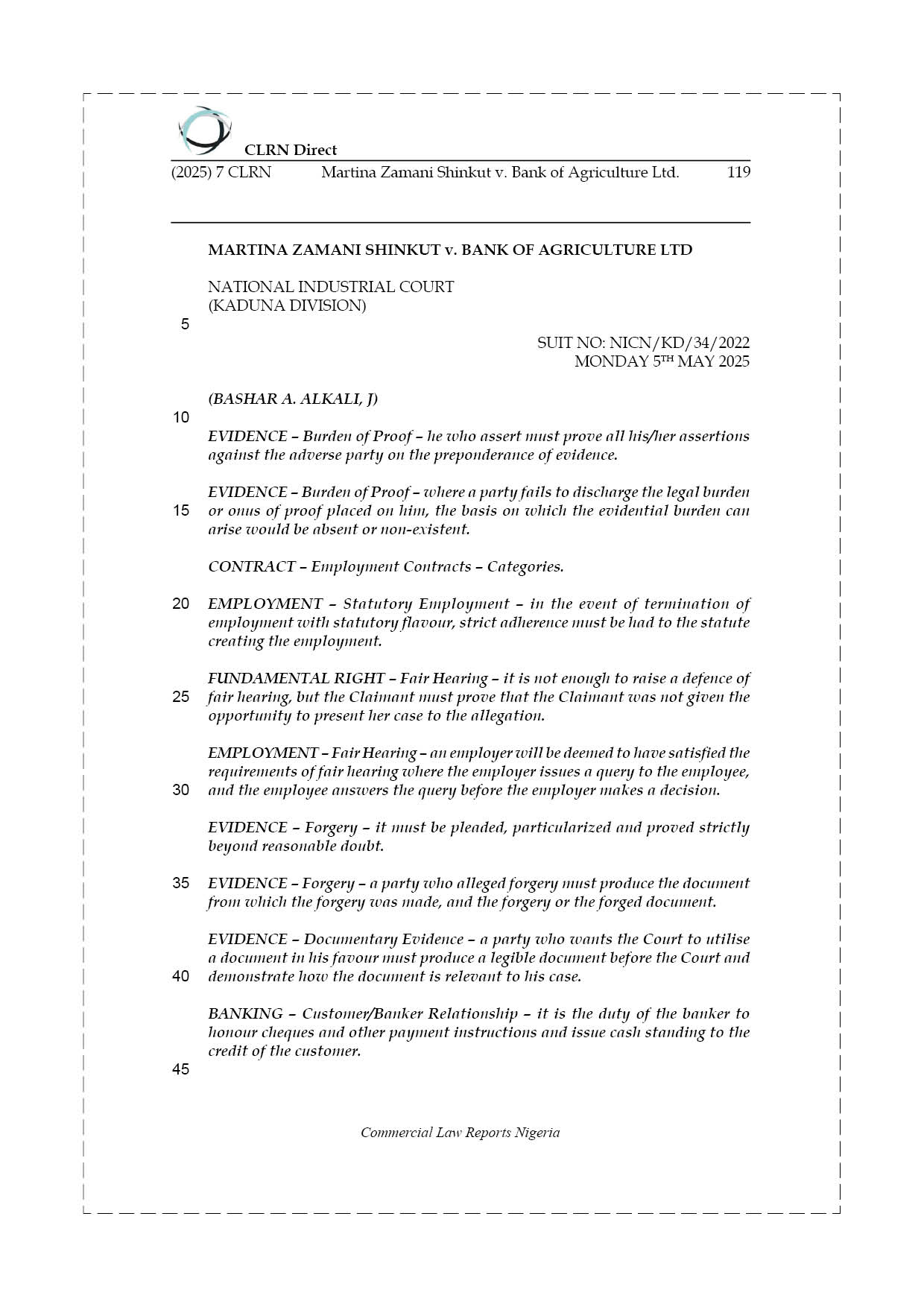 The Claimant was employed by the Defendant bank, an institution formed from the merger of the defunct People’s Bank of Nigeria and others. Her employment began on a probationary basis on November 11, 1999, and was confirmed on June 20, 2003, following a positive performance review. Over the course of more than 20 years, the Claimant served diligently and rose to the position of Assistant Manager, Head of Credit, and Acting Branch Head at the Defendant’s Kafanchan Branch in Kaduna State. Her employment was governed by a letter of appointment and the Defendant’s Conditions of Service. In March 2019, a former customer of the bank, Mrs. Fatima Mamman (a dismissed teacher), requested her account statement in order to process her pension entitlements. A withdrawal of ₦332,000 made from her salary account on October 22, 2013, was discovered. At the time of the transaction, the Branch Head was Mr. John Tafiya, with Mr. Maigida Jacob as Head of Retail Banking, and the Claimant serving as cashier. Due to the passage of six years and the Defendant’s non-computerized system, neither the Claimant nor Mr. Jacob could initially recall the transaction or locate relevant records.