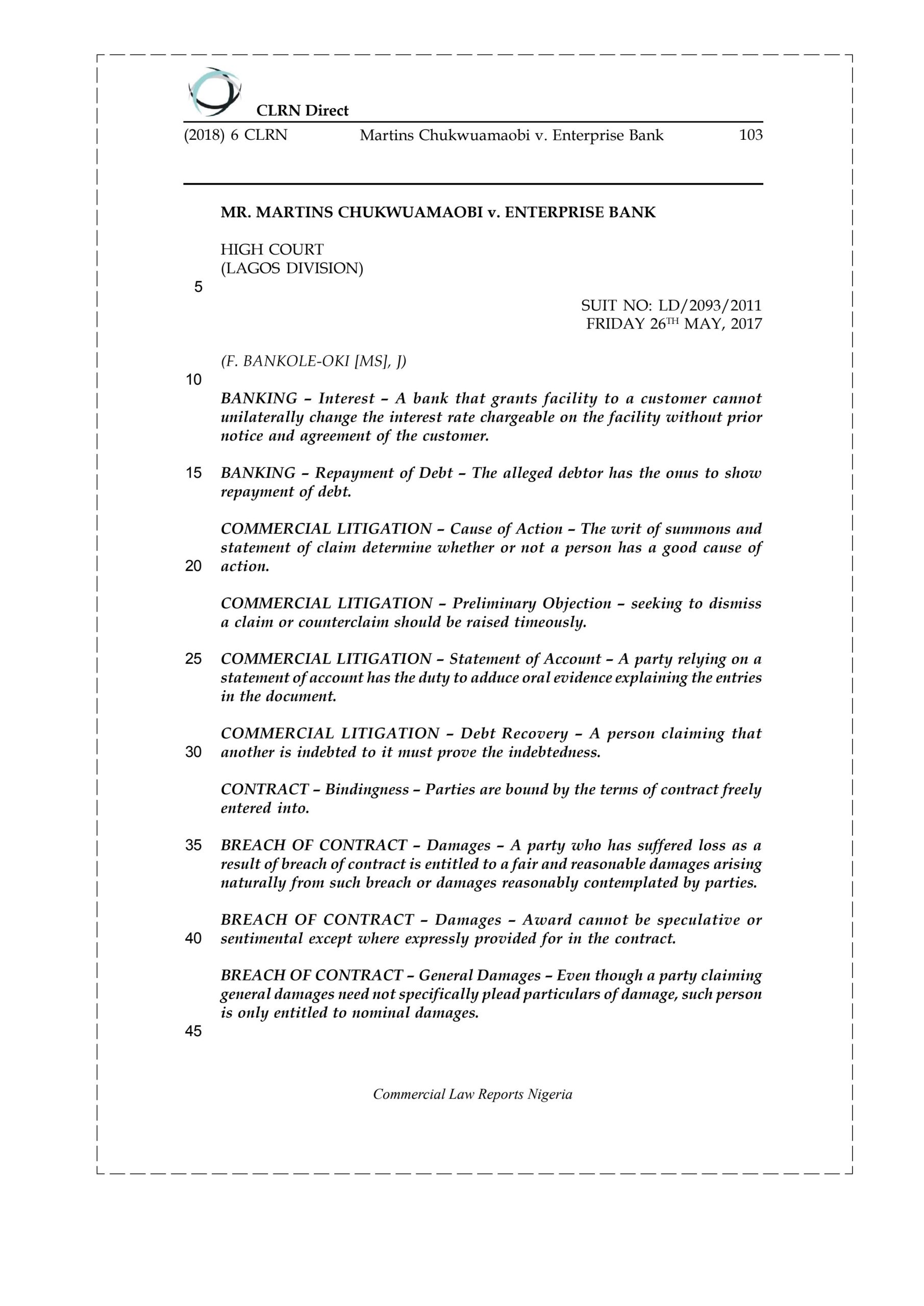 The claimant is a customer of the defendant, a banking institution and had been enjoying credit facilities from the bank before September, 2008 when he applied and was granted another facility of N1,800,000.00 (One Million, Eight Hundred Thousand Naira) to purchase a used car. The claimant sued the defendant at the High Court of Lagos State alleging several infractions and illegal deductions and charges on the account opened for the facility. One of the alleged infractions was that immediately after the facility was paid into his account, the defendant illegally deducted the sum of N469,755.87 (Forty Hundred Sixty Nine Thousand, Seven Hundred Fifty Five Naira, Eighty Seven Kobo) and other arbitrary deductions. The claimant further alleged that twenty one percent interest per annum was agreed by the parties with a thirty-six months repayment period but that the defendant had been illegally deducting the sum of N89,997.03 (Eighty Nine Thousand, Nine Hundred and Ninety Seven Naira, Three Kobo) on a monthly basis from December, 2008 to May, 2011. The claimant alleged that the monthly deduction was only reversed in 2011 when he made a complaint to the defendant but that the defendant only refunded the excess charges up to 2009 and has refused to refund the excess charges from 2009 to 2011. The claimant also alleged that the defendant accused him of fraud and reported the transaction between them to the Special Fraud unit of the Police who visited him at his office causing him embarrassment in the presence of a client. The claimant stated that he was detained by the police on the instigation of defendant and made to sign various cheques in favour of the defendant amounting to N909,411.64 (Nine Hundred and Nine Thousand, Four Hundred and Eleven Naira, Sixty Four Kobo) and a cash deposit of N60,000 (Sixty Thousand Naira) to the Police.