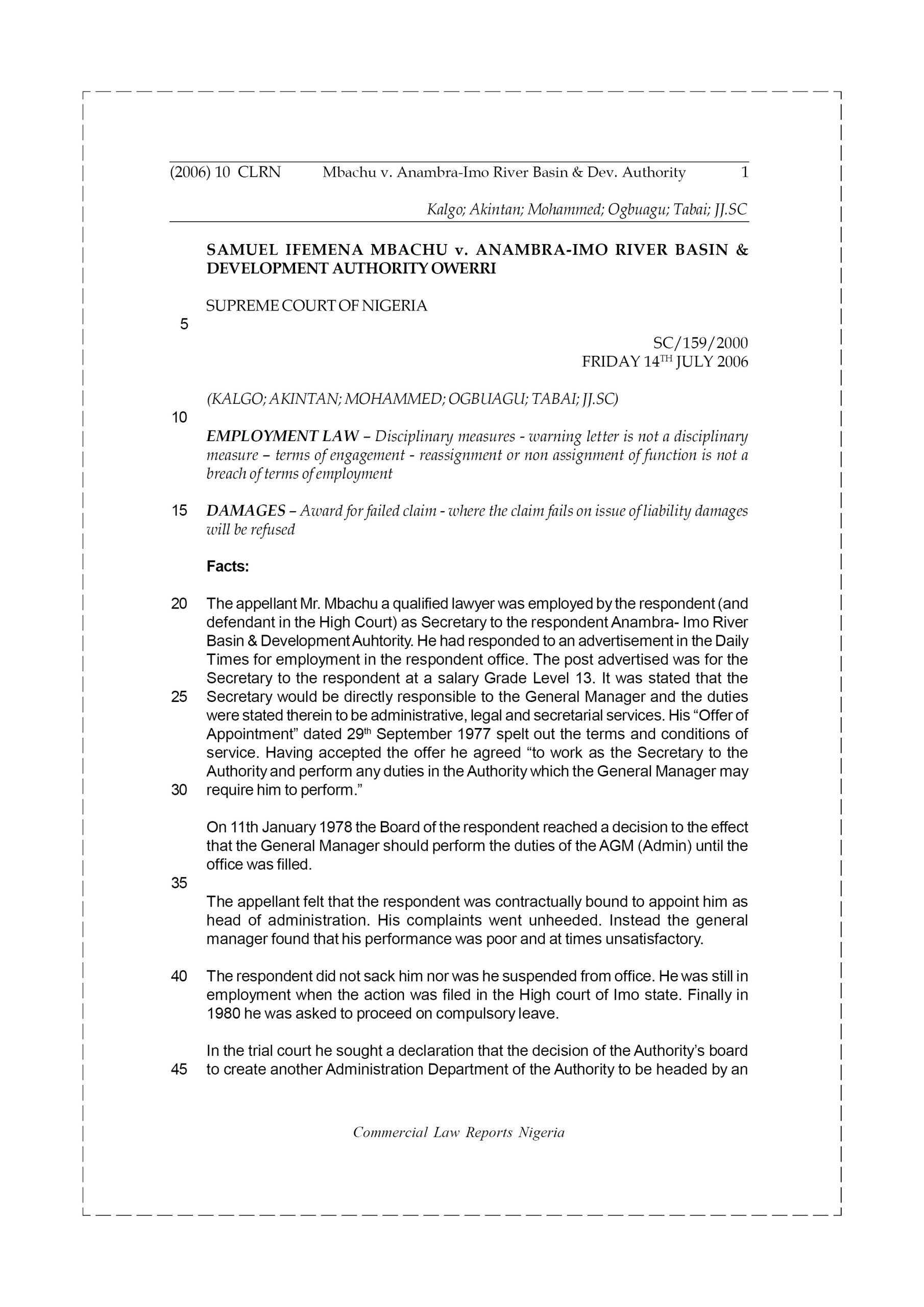 The appellant Mr. Mbachu a qualified lawyer was employed by the respondent (and defendant in the High Court) as Secretary to the respondent Anambra- Imo River Basin & Development Auhtority. He had responded to an advertisement in the Daily Times for employment in the respondent office. The post advertised was for the Secretary to the respondent at a salary Grade Level 13. It was stated that the Secretary would be directly responsible to the General Manager and the duties were stated therein to be administrative, legal and secretarial services. His “Offer of Appointment” dated 29th September 1977 spelt out the terms and conditions of service. Having accepted the offer he agreed “to work as the Secretary to the Authority and perform any duties in the Authority which the General Manager may require him to perform.”
