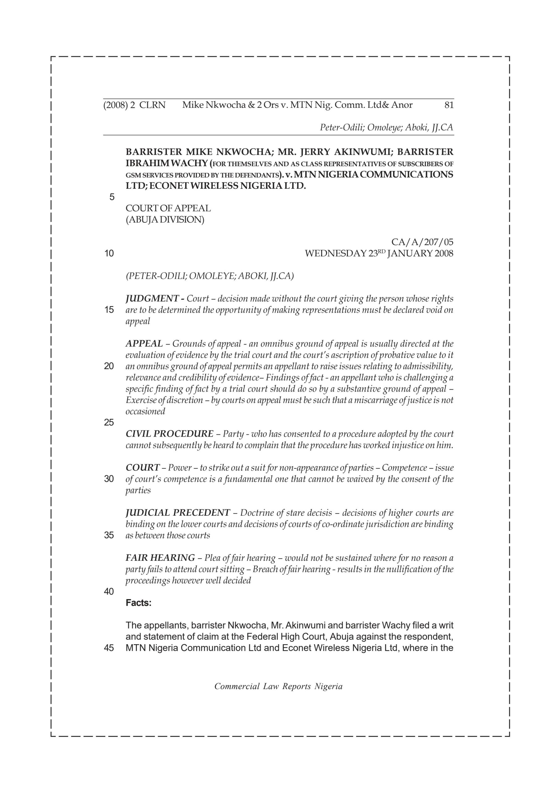 The appellants, barrister Nkwocha, Mr. Akinwumi and barrister Wachy filed a writ and statement of claim at the Federal High Court, Abuja against the respondent, MTN Nigeria Communication Ltd and Econet Wireless Nigeria Ltd, where in the appellants alleged several breaches of contract by the respondents. They also alleged breaches by the respondents of their digital mobile licences in that the respondents failed to ensure that the traffic capacity provided in their systems would be dimensioned to guarantee a satisfactory grade of service.