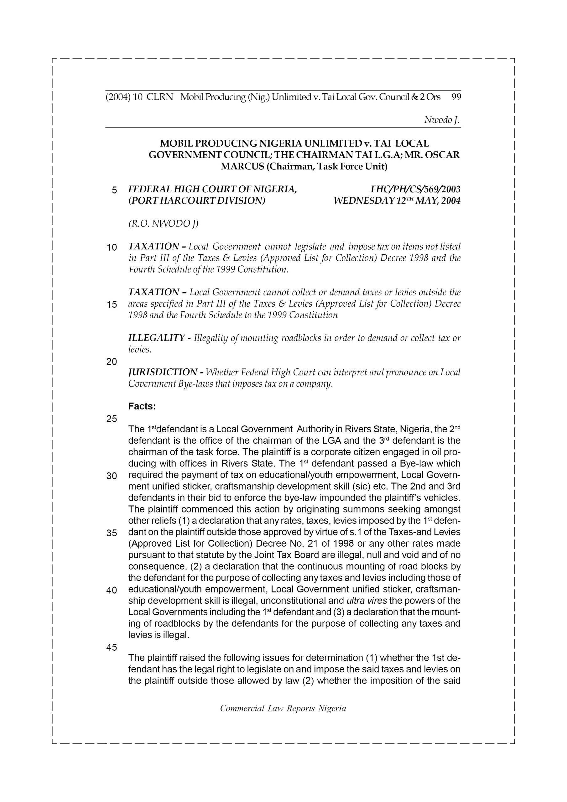The plaintiff commenced this action by originating summons seeking amongst other reliefs (1) a declaration that any rates, taxes, levies imposed by the 1st defendant on the plaintiff outside those approved by virtue of s.1 of the Taxes-and Levies (Approved List for Collection) Decree No. 21 of 1998 or any other rates made pursuant to that statute by the Joint Tax Board are illegal, null and void and of no consequence. (2) a declaration that the continuous mounting of road blocks by the defendant for the purpose of collecting any taxes and levies including those of educational/youth empowerment, Local Government unified sticker, craftsmanship development skill is illegal, unconstitutional and ultra vires the powers of the Local Governments including the 1st defendant and (3) a declaration that the mounting of roadblocks by the defendants for the purpose of collecting any taxes and levies is illegal.