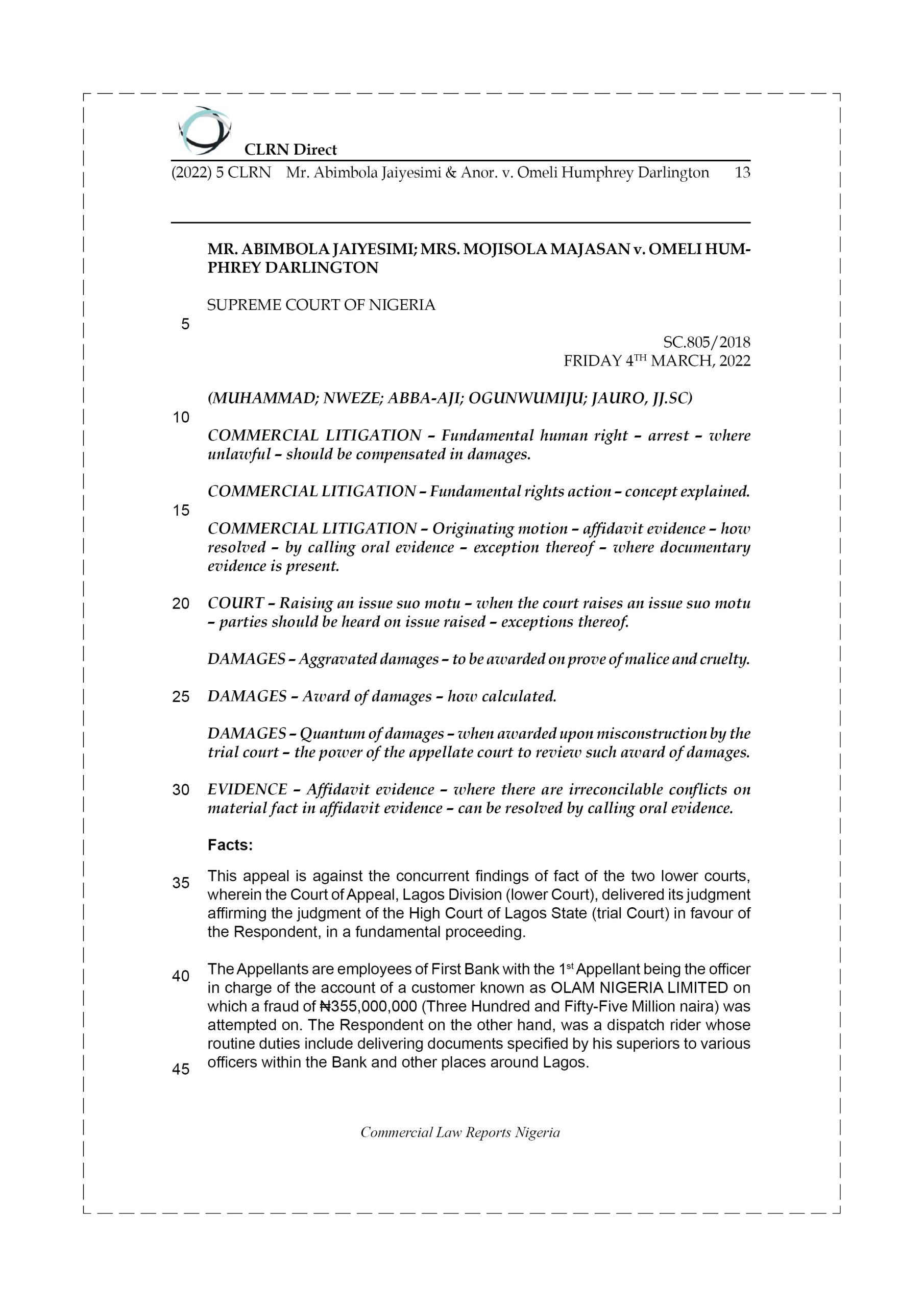 The Respondent was instructed to take four (4) funds transfer forms originating from the account of OLAM NIGERIA LIMITED to the Operations Manager at the Head Office to effect the transfer of the total sum of N355 million into four Corporate Accounts. After the dispatch, he was summoned to the office where after, the two Appellants caused him to be detained at the Lion Building Police Station because he refused to agree that he submitted the transfer funds in error to the Operations Manager. He was therefore detained for two days at the Lion Building Police Station cell and bailed on the 3rd day. Subsequently that same night, the Bank’s security men on the instruction of the Appellants got the Respondent detained at Ikoyi Police Station. He was detained for seven (7) days and charged at the Magistrates’ Court 11 in Lagos State. After numerous adjournments, the Magistrates’ court struck out the charge for lack of diligent prosecution. After his discharge by the Magistrates’ Court, the Respondent instituted proceedings to enforce his fundamental human rights to personal liberty and dignity and for damages for his unlawful incarceration at various police stations for several days for no just cause. After hearing the application, the trial court found and held that the rights of the Respondent had been infringed and awarded exemplary damages of Ten Million Naira (₦10,000,000) against the 1st Appellant and Seven Million, Five Hundred Thousand Naira (₦7,500,000) against the 2nd Appellant and costs of the action at ₦1 million each against the Appellants. The Appellants being dissatisfied with the judgement of the trial court, appealed to the lower court. The lower Court after it re-evaluated the evidence at trial and considered the issues raised by the parties, held that the trial court discharged its primary duty of evaluating evidence and its conclusion after the evaluation was not perverse and that the trial court justified its findings of violation of human rights against the Appellants. The lower Court also held there was no appeal against the award of aggravated damages and refused to decide the point.