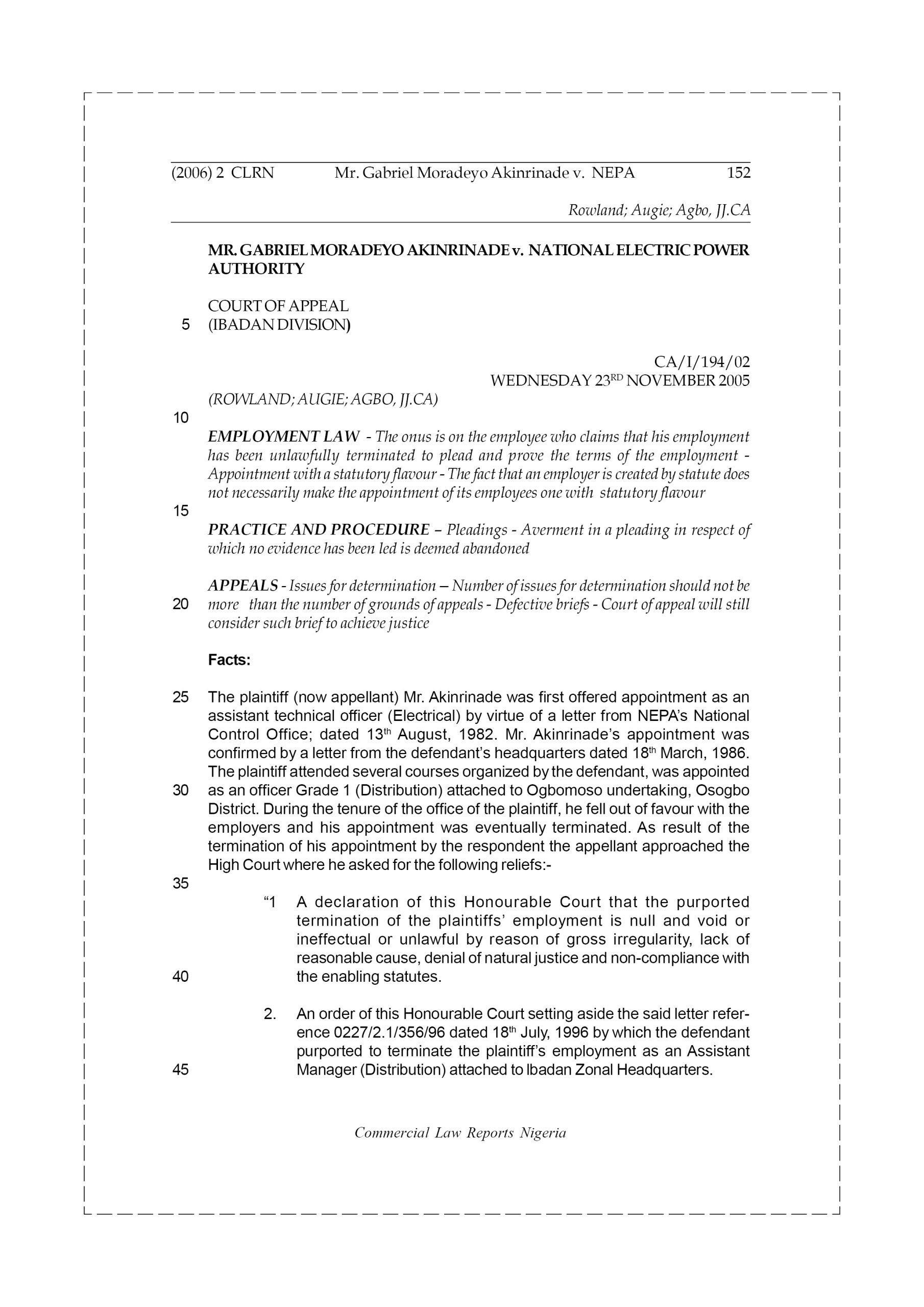 The plaintiff (now appellant) Mr. Akinrinade was first offered appointment as an assistant technical officer (Electrical) by virtue of a letter from NEPA’s National Control Office; dated 13th August, 1982. Mr. Akinrinade’s appointment was confirmed by a letter from the defendant’s headquarters dated 18th March, 1986. The plaintiff attended several courses organized by the defendant, was appointed as an officer Grade 1 (Distribution) attached to Ogbomoso undertaking, Osogbo District. During the tenure of the office of the plaintiff, he fell out of favour with the employers and his appointment was eventually terminated. As result of the termination of his appointment by the respondent the appellant approached the High Court where he asked for the following reliefs:-