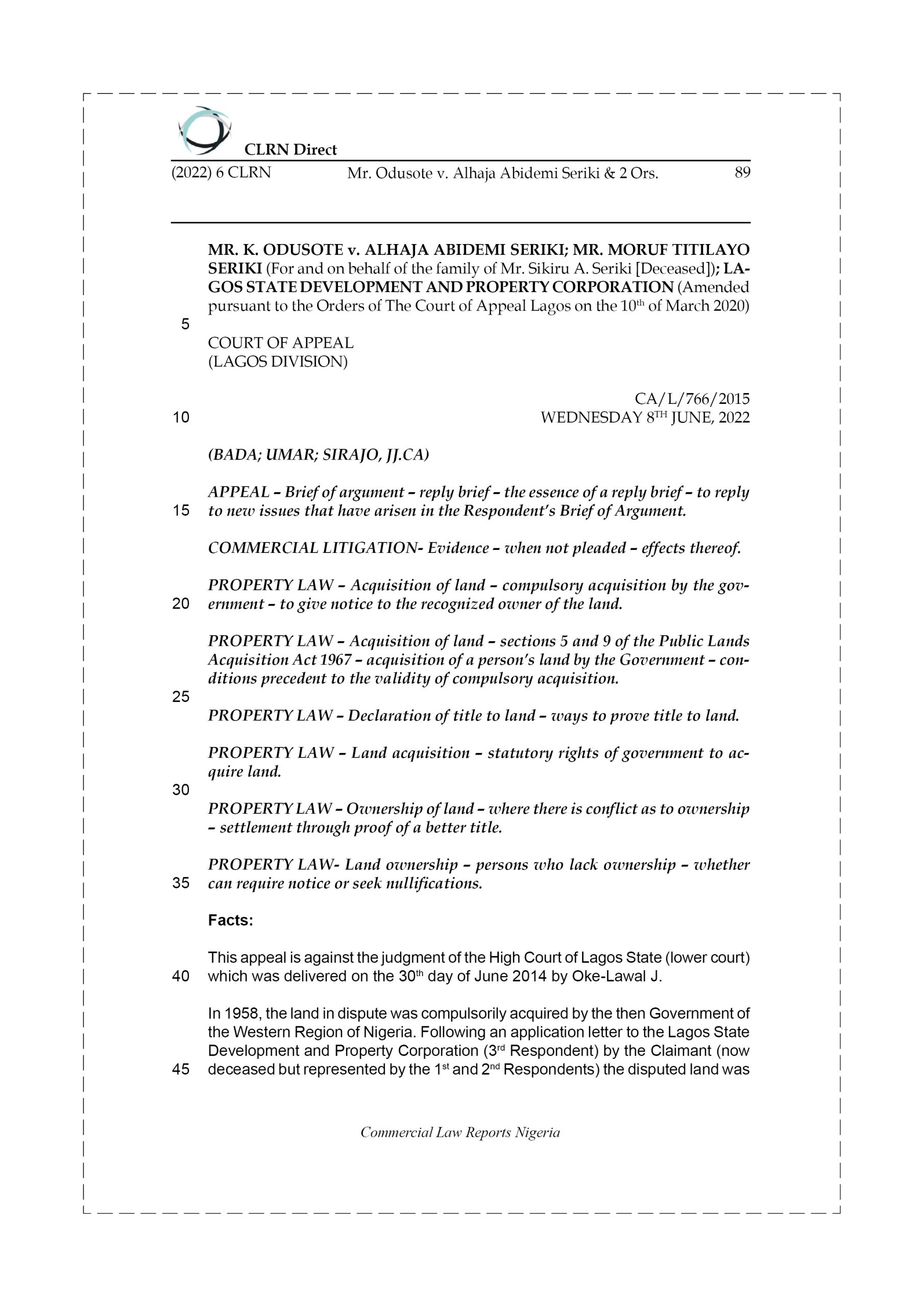 Upon the conclusion of the trial. The lower court in a considered judgment granted the reliefs sought by Mr. S.A. Seriki (deceased Claimant) and dismissed the Appellant’s application.