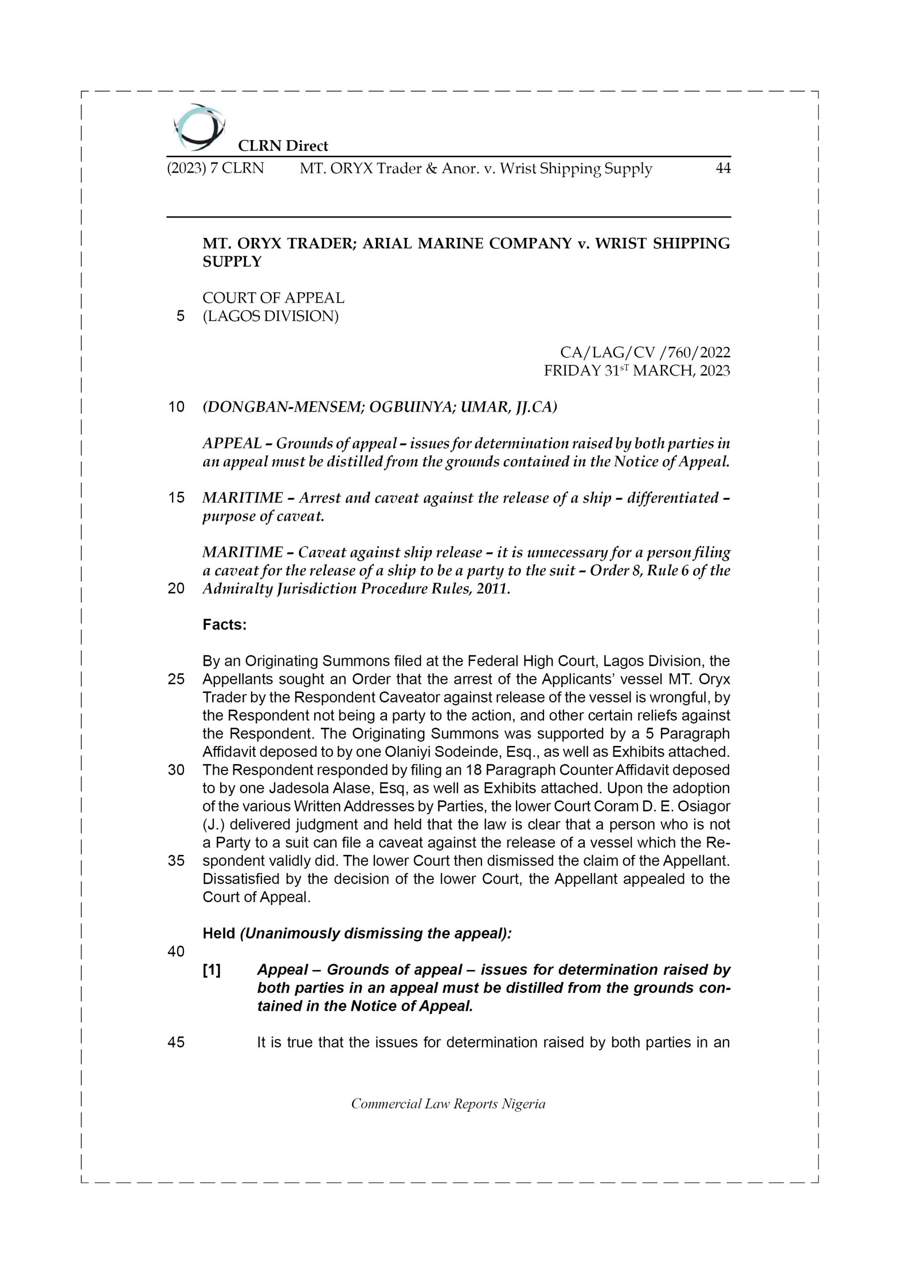 By an Originating Summons filed at the Federal High Court, Lagos Division, the Appellants sought an Order that the arrest of the Applicants’ vessel MT. Oryx Trader by the Respondent Caveator against release of the vessel is wrongful, by the Respondent not being a party to the action, and other certain reliefs against the Respondent. The Originating Summons was supported by a 5 Paragraph Affidavit deposed to by one Olaniyi Sodeinde, Esq., as well as Exhibits attached. The Respondent responded by filing an 18 Paragraph Counter Affidavit deposed to by one Jadesola Alase, Esq, as well as Exhibits attached. Upon the adoption of the various Written Addresses by Parties, the lower Court Coram D. E. Osiagor (J.) delivered judgment and held that the law is clear that a person who is not a Party to a suit can file a caveat against the release of a vessel which the Respondent validly did. The lower Court then dismissed the claim of the Appellant.