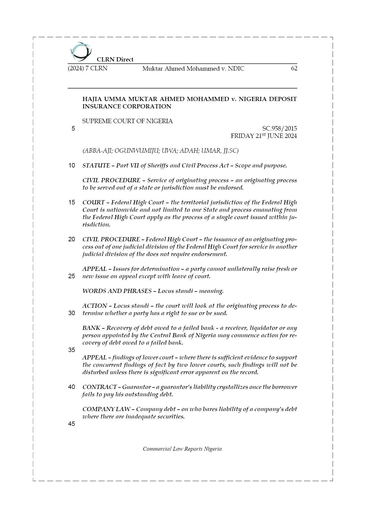 The action was commenced at the Federal High Court, Lagos but subsequently transferred to the Federal High Court, Kaduna for determination. It was the respondent’s grouse that in the exercise of its statutory duties as the liquidator of the defunct Commercial Trust Bank Limited (“the bank” or “the failed bank”), it discovered the indebtedness of Credit and Finance Limited (“the Company”) to the bank to the tune of N14,795,399.71k (Fourteen Million, Seven Hundred And Ninety-Five Thousand, Three Hundred And Ninety-Nine Naira And Seventy-One Kobo).