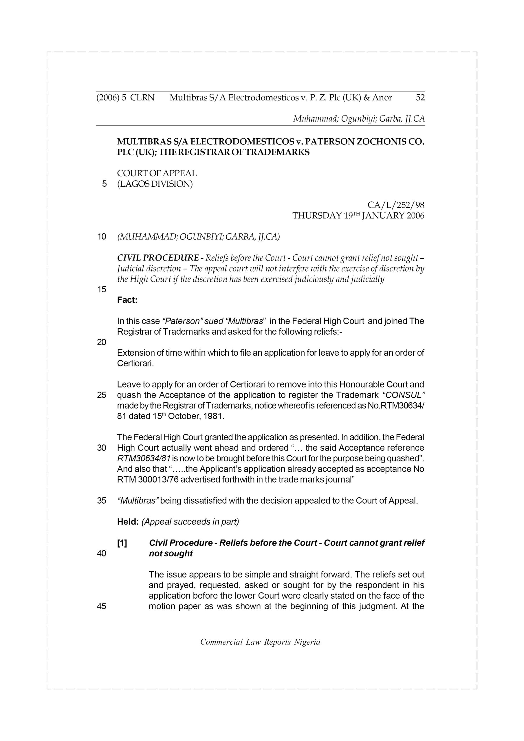 In this case “Paterson” sued “Multibras” in the Federal High Court and joined The Registrar of Trademarks and asked for the following reliefs:-
